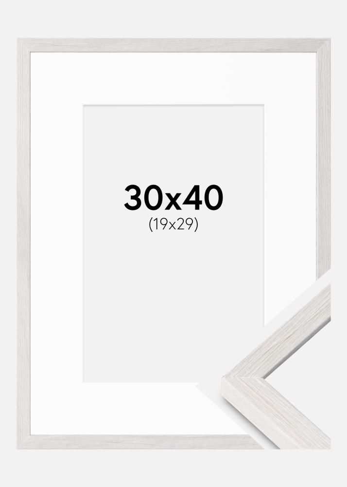 Mat board fits picture in 20x30 cm. The frame color is white oak-colored with a width of 15 mm and a depth of 20 mm.