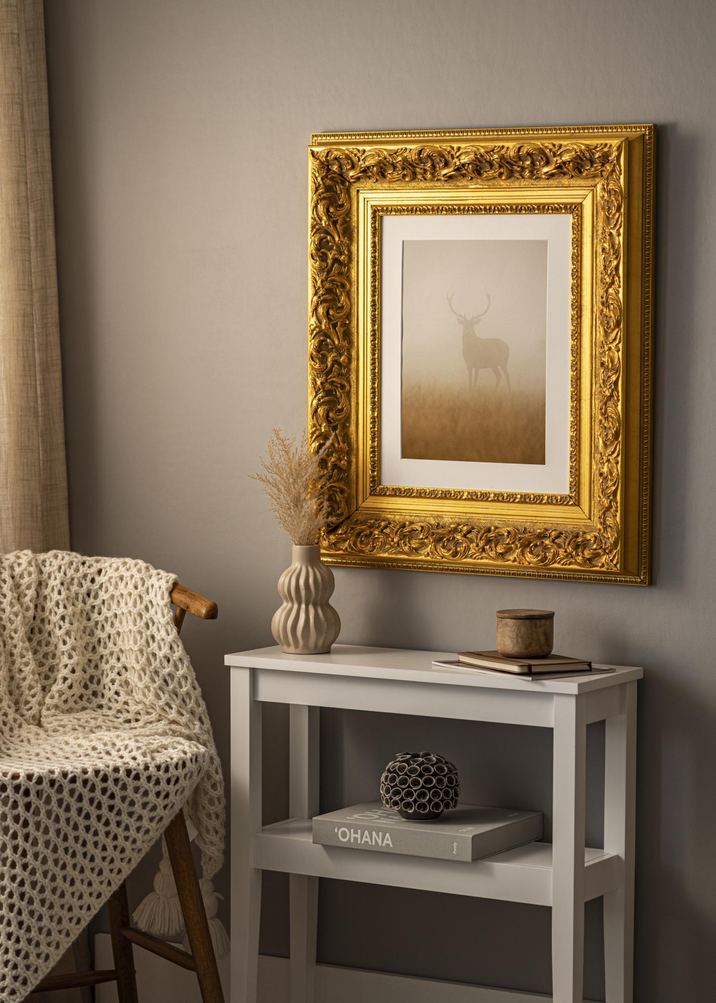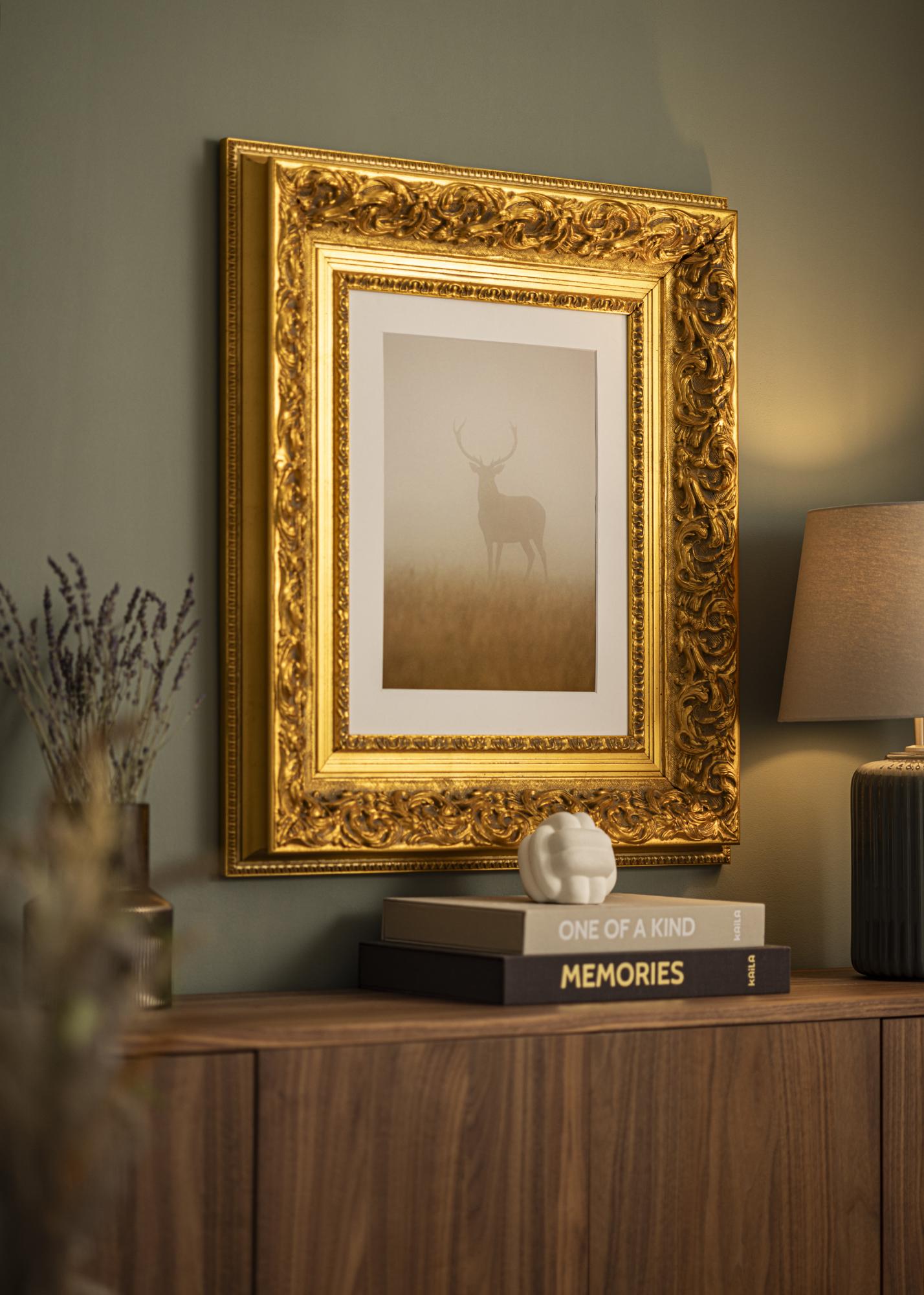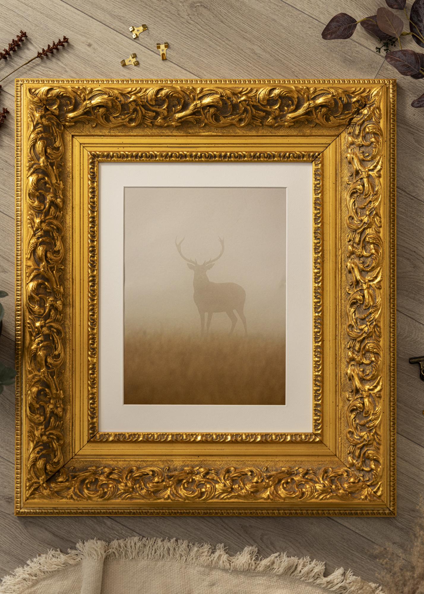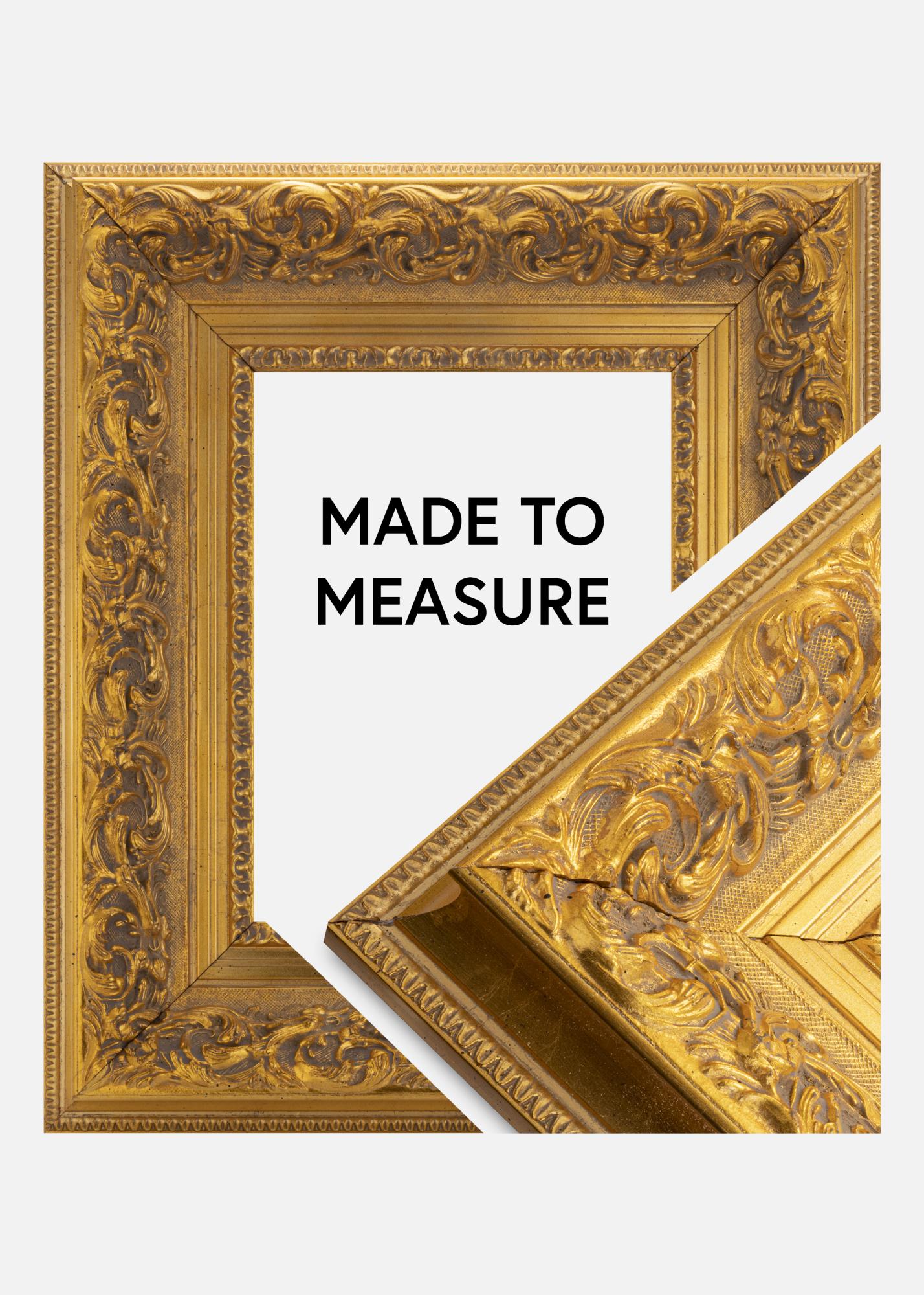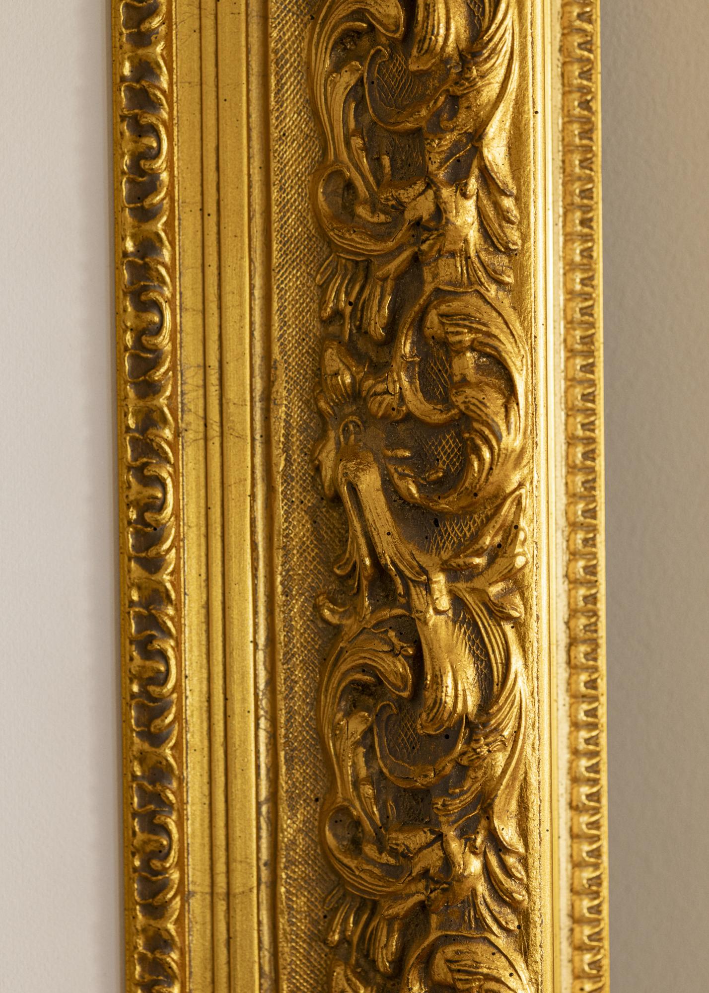 Our Frame Birmingham Gold is a custom-made picture frame that is manufactured in our own framing workshop. With its deep gold tone and classic baroque design, it becomes an elegant addition to any room. This photo frame has a 152 mm wide frame list and a depth of 74 mm, which gives it an impressive presence on the wall.
