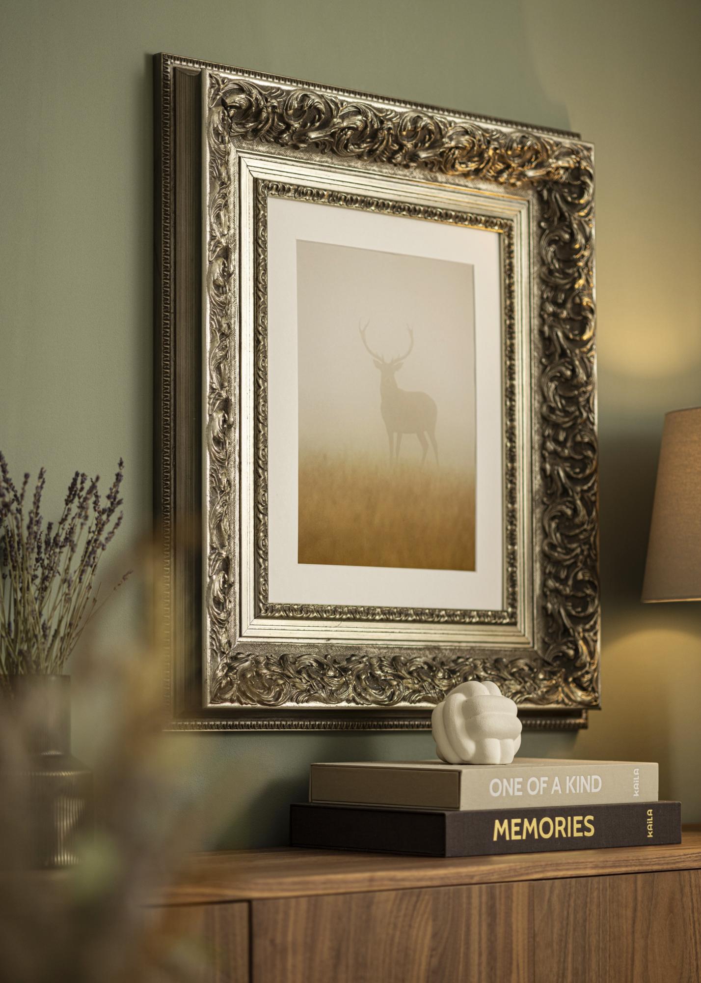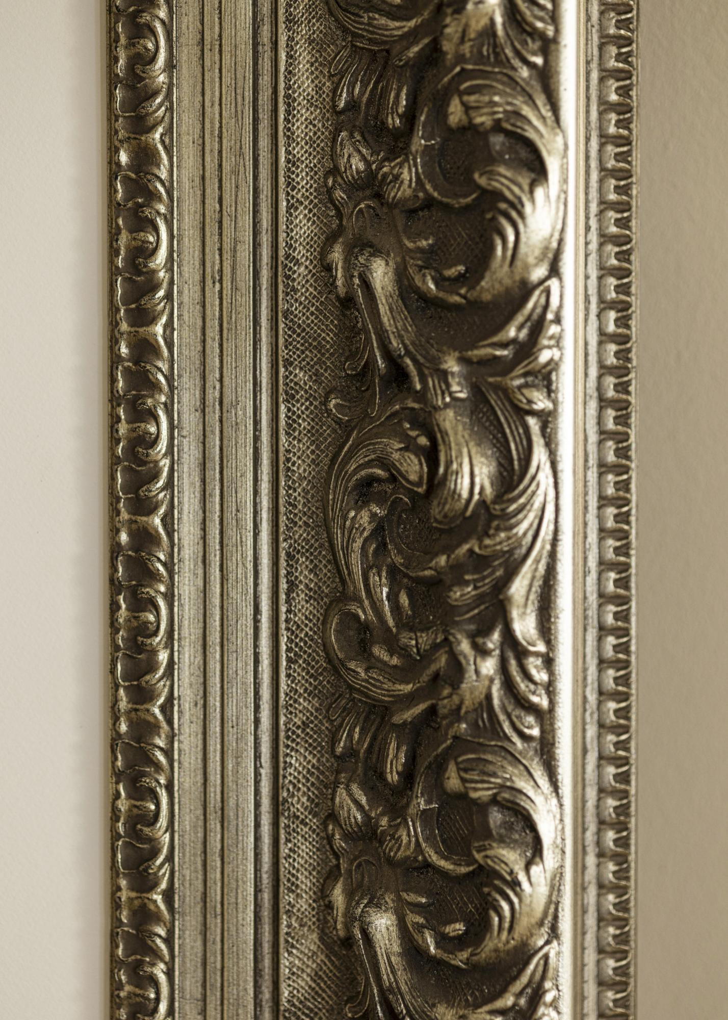 This richly ornamented frame in antique silver features intricate details and a beautiful patina that imparts a sense of elegance and timelessness. The deep relief highlights the sculpted leaf patterns, making it a perfect choice for classical motifs and framing that requires a distinctive and decorative picture frame.