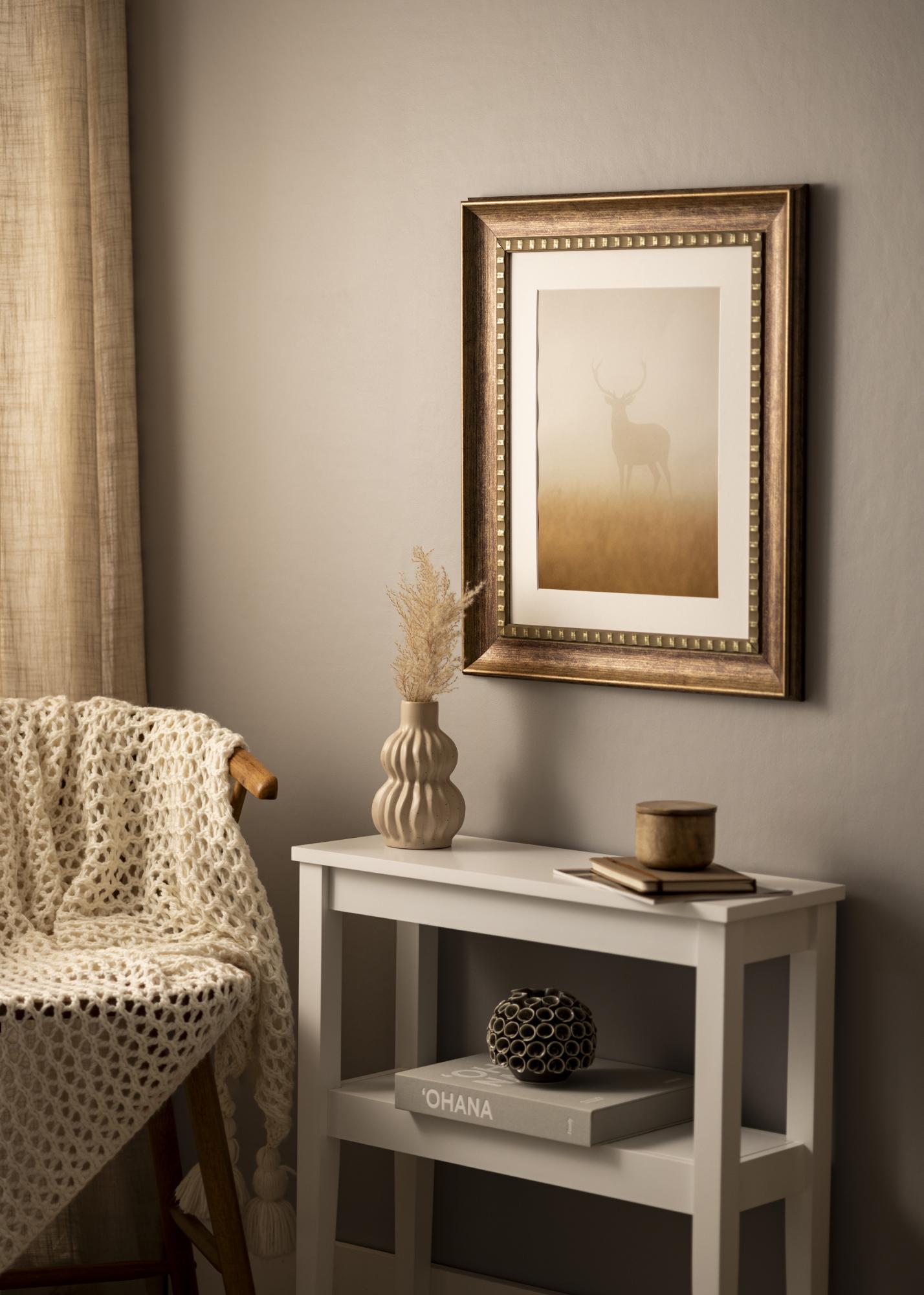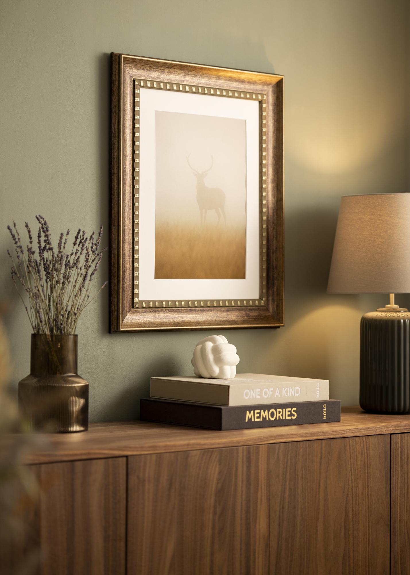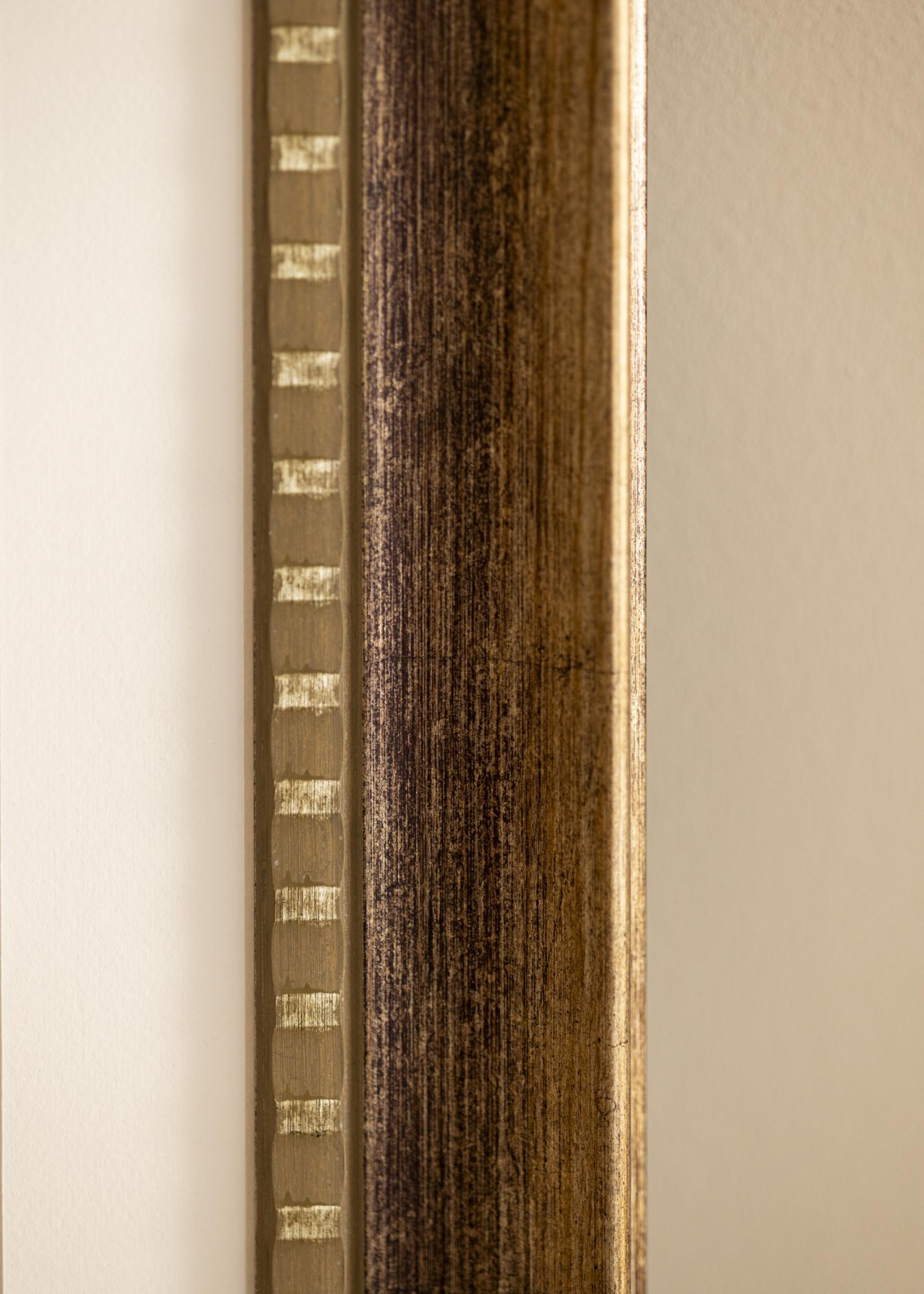 Camden Silver has a warm brown color with a subtle antique finish that gives it a rustic character. The surface is provided with a light graining that mimics natural wood, enhancing its vintage expression. The decorative inner edge is adorned with small, regular gold-colored details that create an elegant contrast against the darker wood tone. The outer edge has a soft chamfer with a discreet gold finish, giving the picture frame a luxurious and timeless feeling.