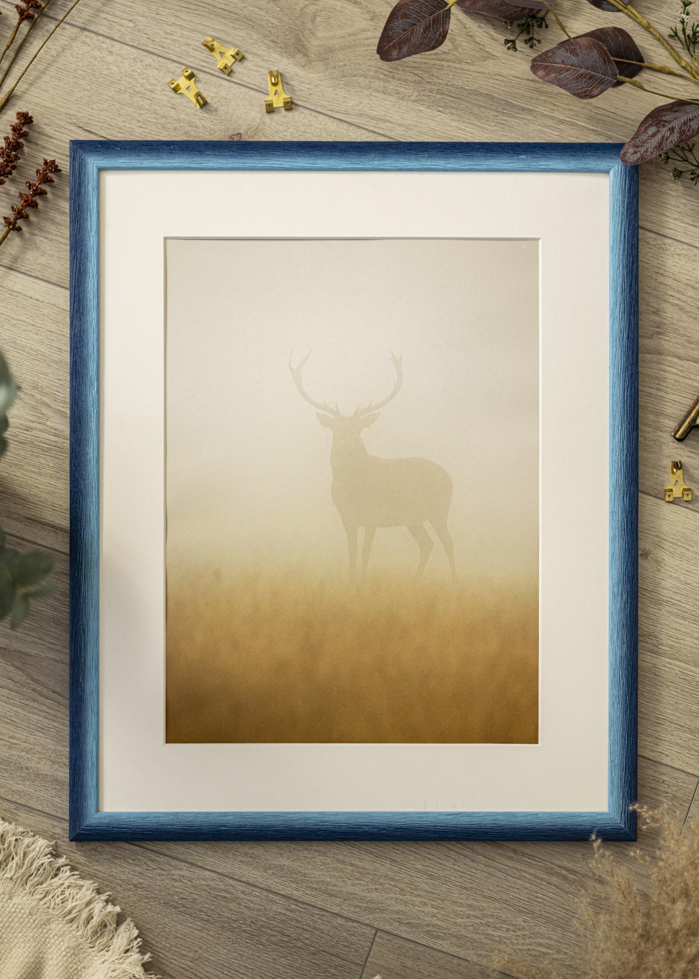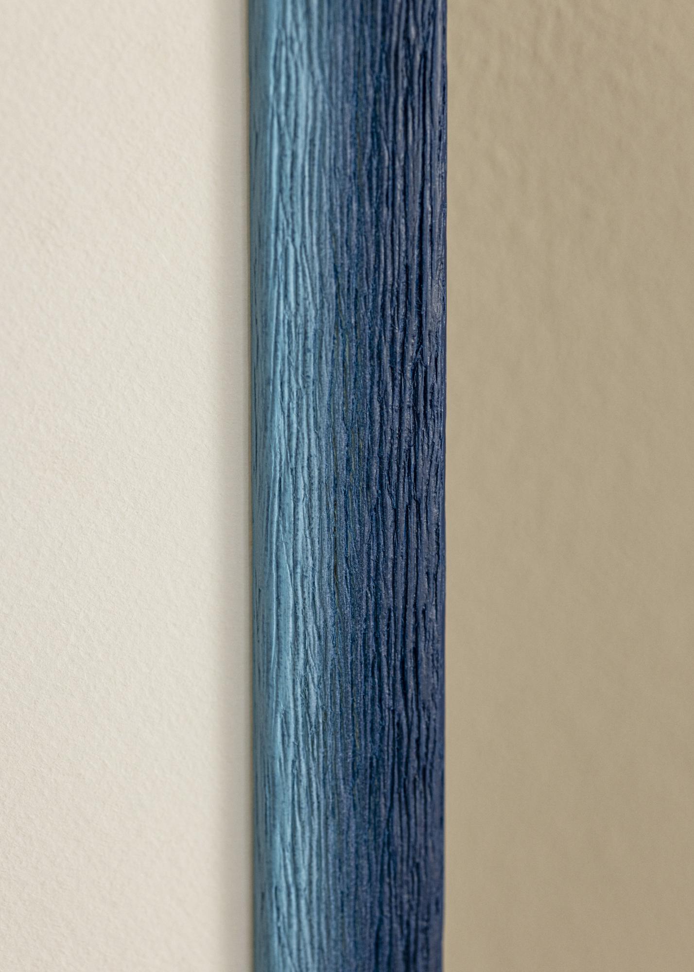 The frame is made of ayous wood, which gives a natural and rustic feel thanks to its prominent wood grain. The deep blue tone subtly fades to a lighter shade along the edges, creating a harmonious and vibrant effect. The hand-painted finish gives the frame a unique character, while the matte surface enhances its timeless elegance.