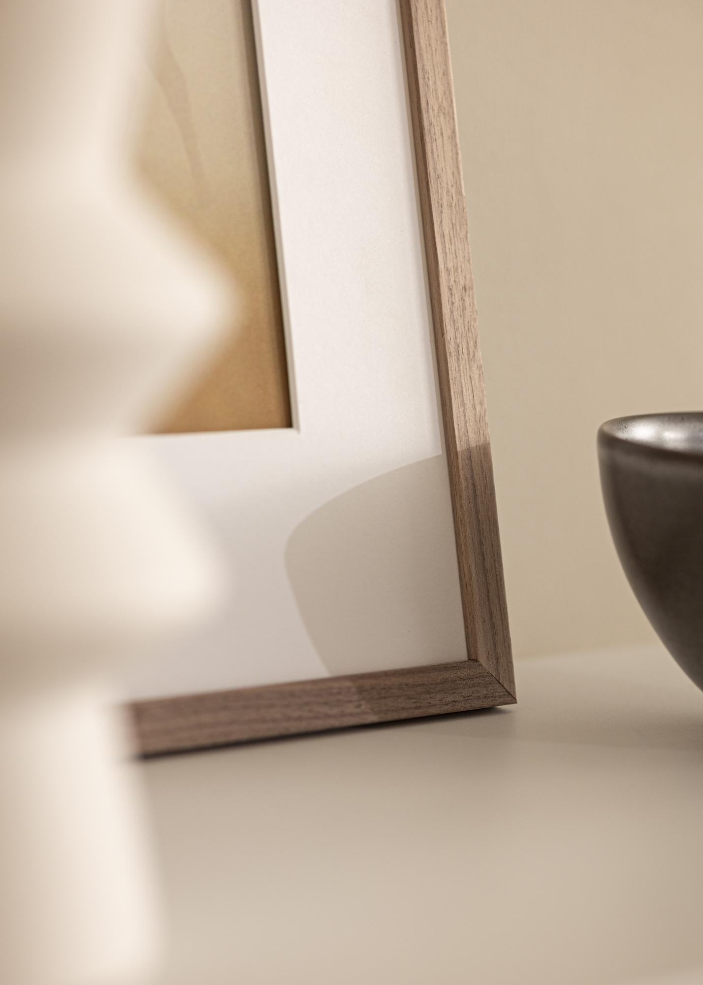 The picture frame is made of genuine walnut veneer and high-quality pine. The fact that the picture frame is made with walnut veneer instead of solid walnut is only an advantage in this case as it contributes to the picture frame having a smooth and even surface – without colour variations.