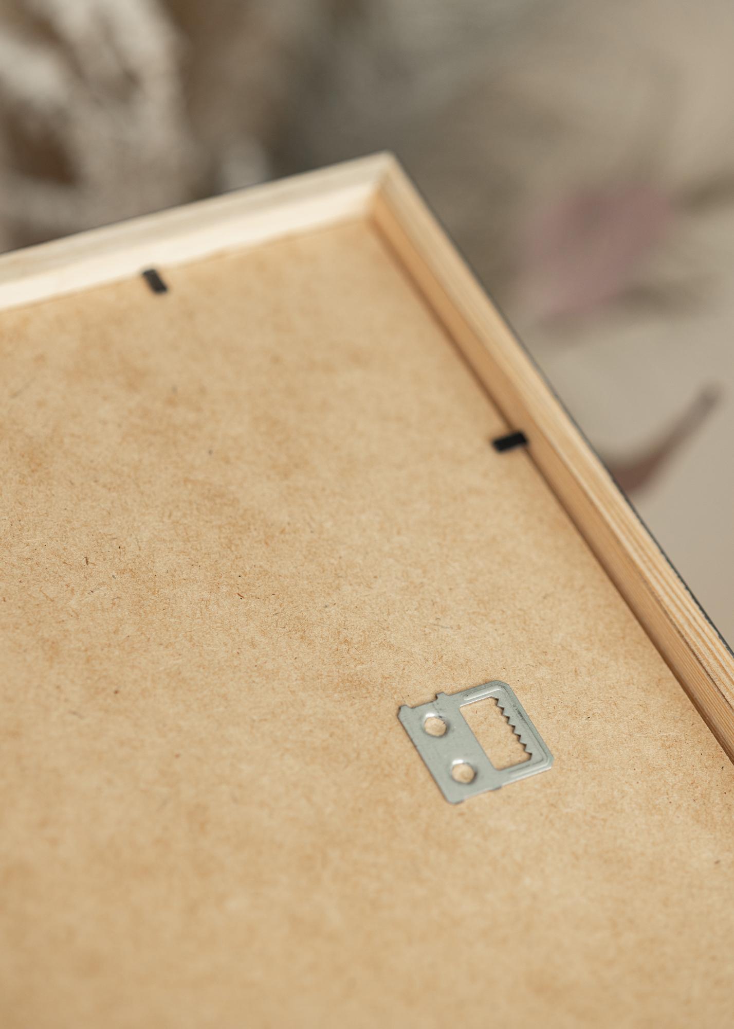 The frame can be mounted on the wall in both portrait and landscape orientation, and it fits just as well alone on the wall as in combination with other picture frames. On the back, there is a backing of HDF material, which is held in place by small pins. To mount your subjects, you bend up the pins and remove the backing.