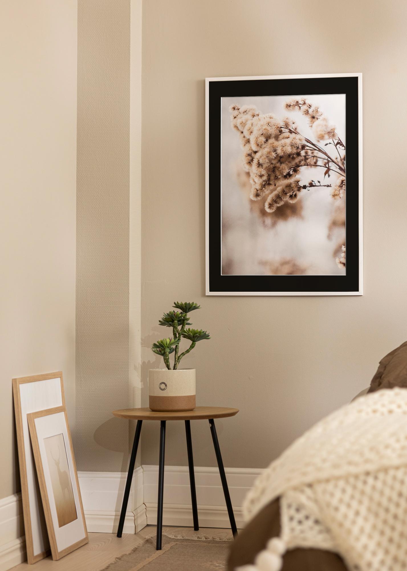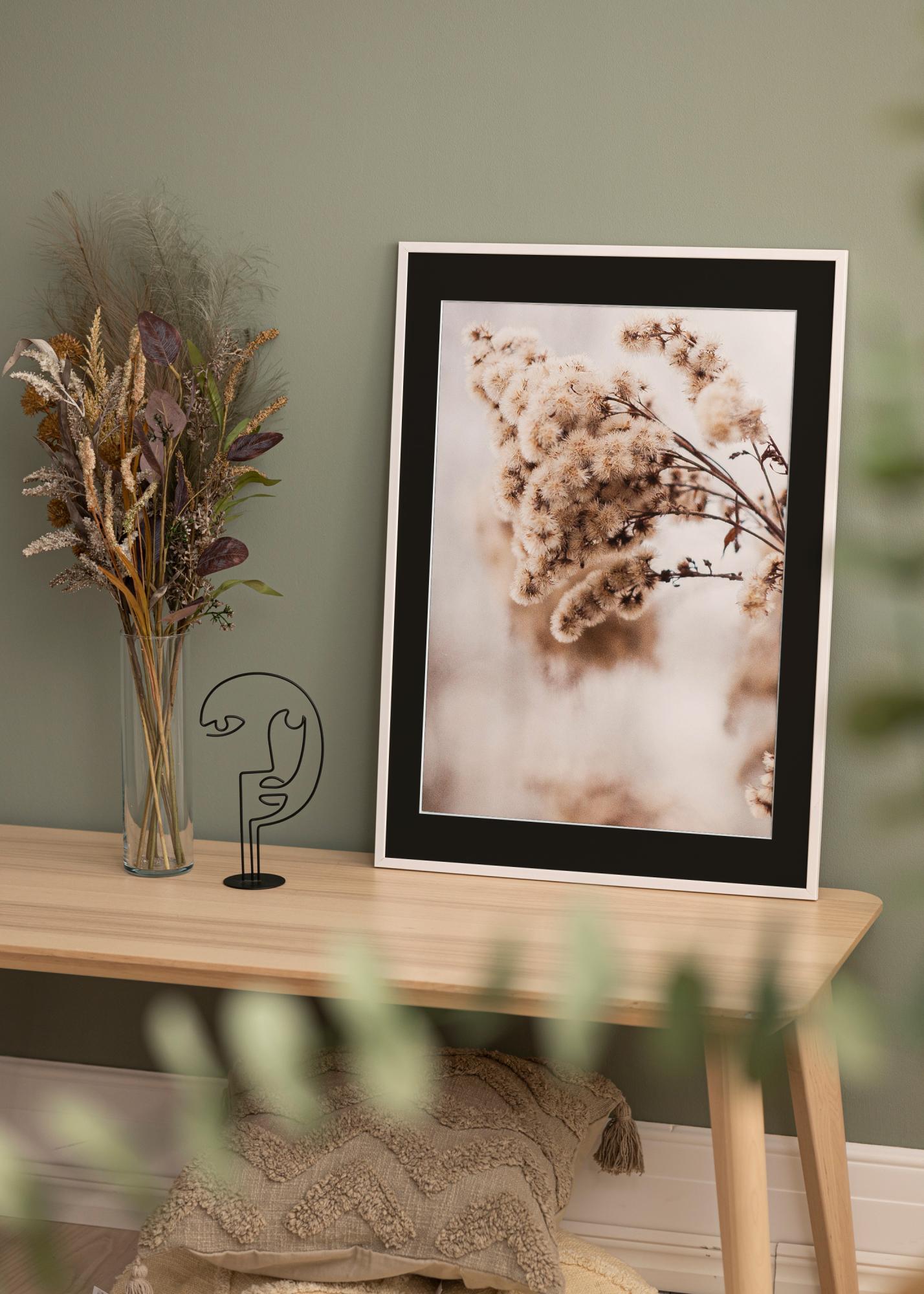 Package including picture frame and matching black mount. The product image shows the dimensions of the frame (indicated in bold) and the inner dimensions of the mount (indicated in brackets). Note that the inner dimensions of the mount should be 1 cm smaller than the image size.
