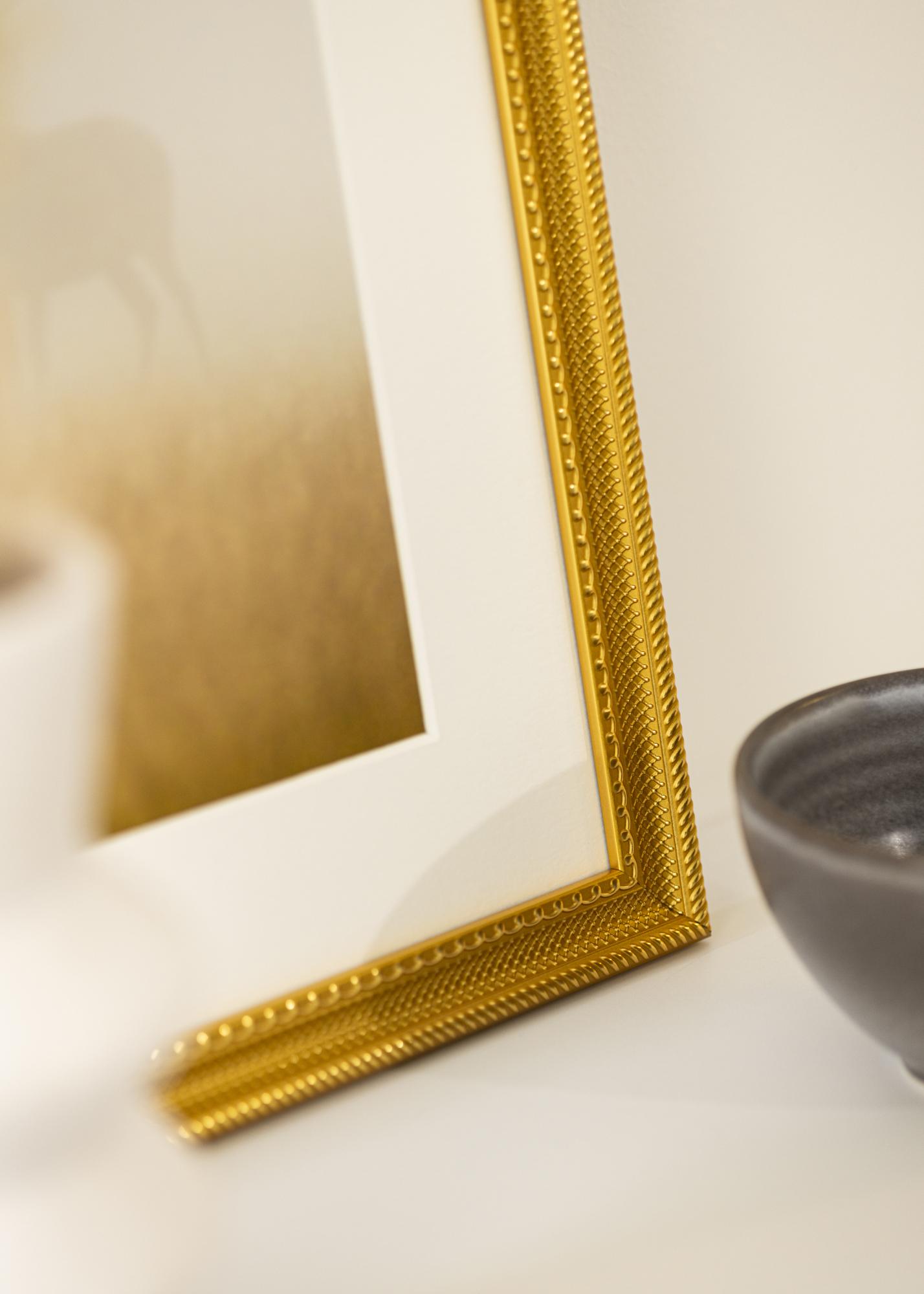 To ensure the glass is in perfect condition upon delivery, the acrylic glass has a protective film on both sides that should be removed before use. This golden picture frame is not only a practical choice but also a decorative element in your home. Whether you place it in the living room, bedroom, or office, it will provide a sophisticated and timeless presentation of your most beloved pictures. The frame fits images sized 21 x 29.7 cm (A4) and is an excellent choice for those seeking both style and function.