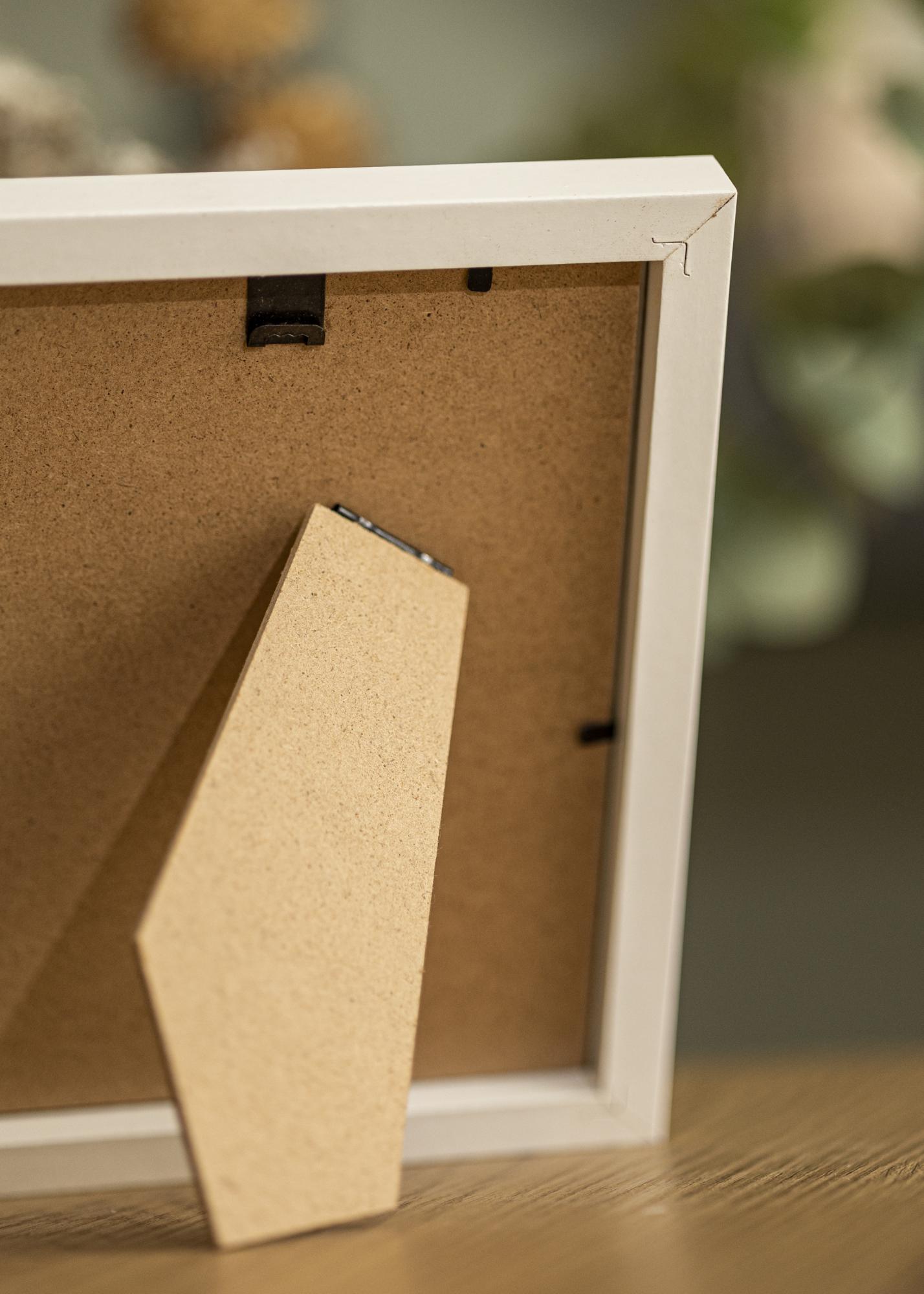 The frame's list has both a width and a depth of 18 mm. The white colour fits well with most motifs and is also easy to match with the rest of your decor. The frame's back is held in place by small pins, which you can easily bend up to remove the back plate and mount your motifs. On the back of the frame, there are practical wall mounts that allow you to hang the frame both vertically and horizontally.