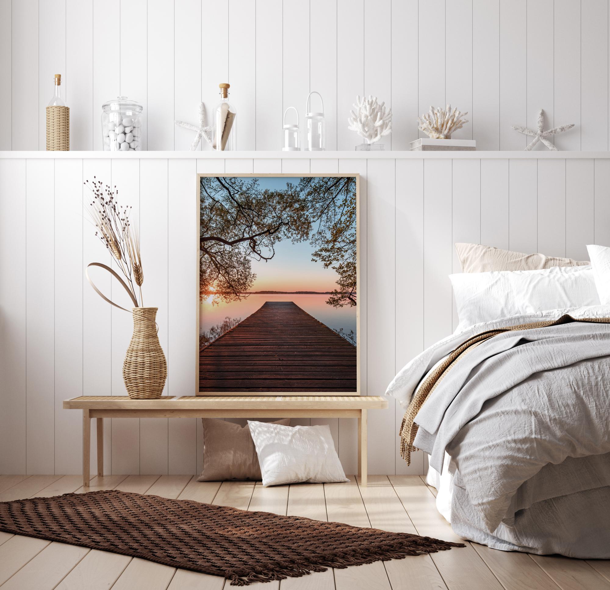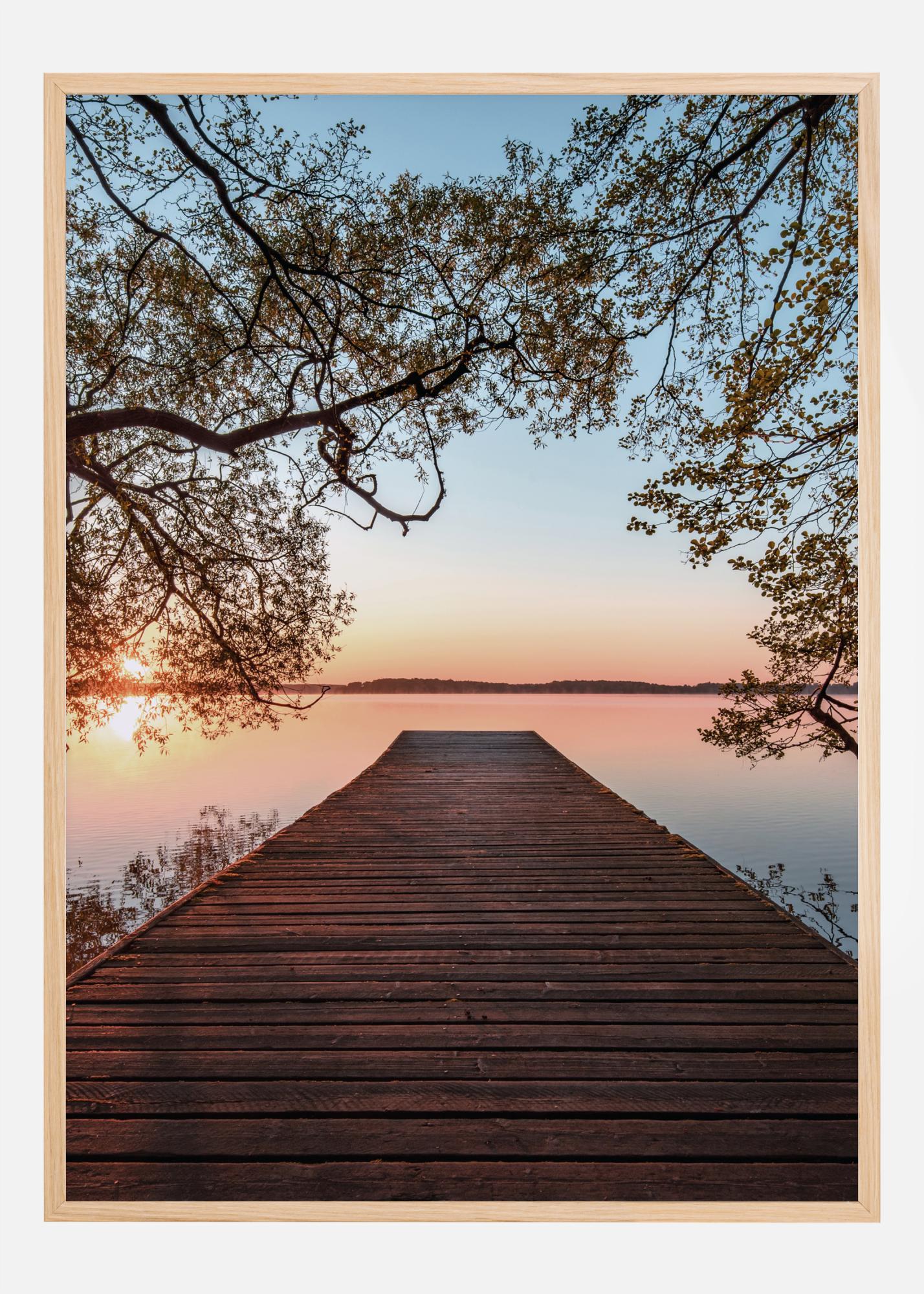 An ambient poster of a walkway heading out into a lake on a bright day. Tree branches frame the walkway as it heads into the soft peach and blue lake and sky. Grab a sense of freedom when you take this home.