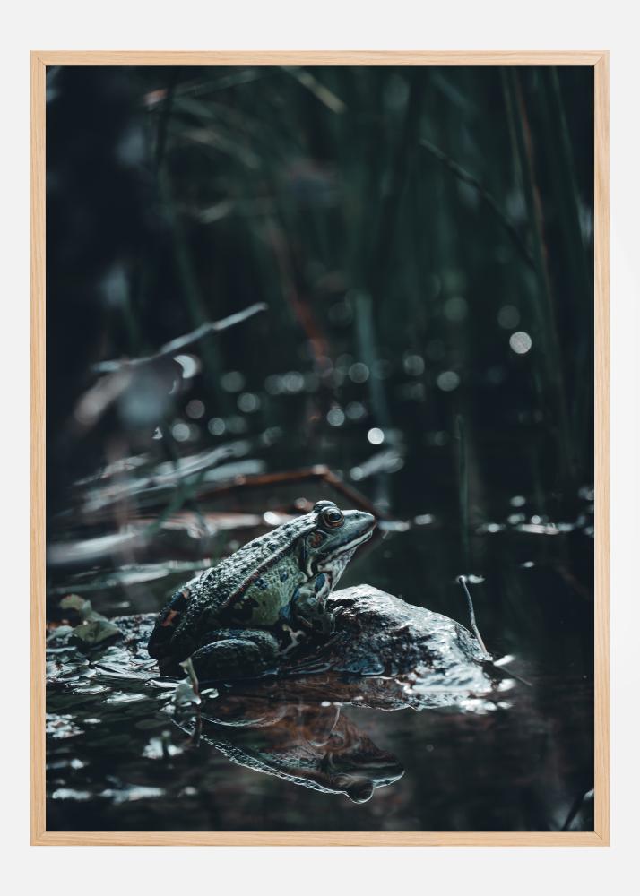 This enchanting poster captures the essence of a quiet moment in nature, where a lone frog is depicted sitting on a rock in the middle of a dark and mysterious pond. The saturated green hues of the frog highlight its vibrancy against the dark, misty background and the shimmering light points of the water's reflection. Its reflection on the calm water surface adds to a deep and thought-provoking atmosphere.