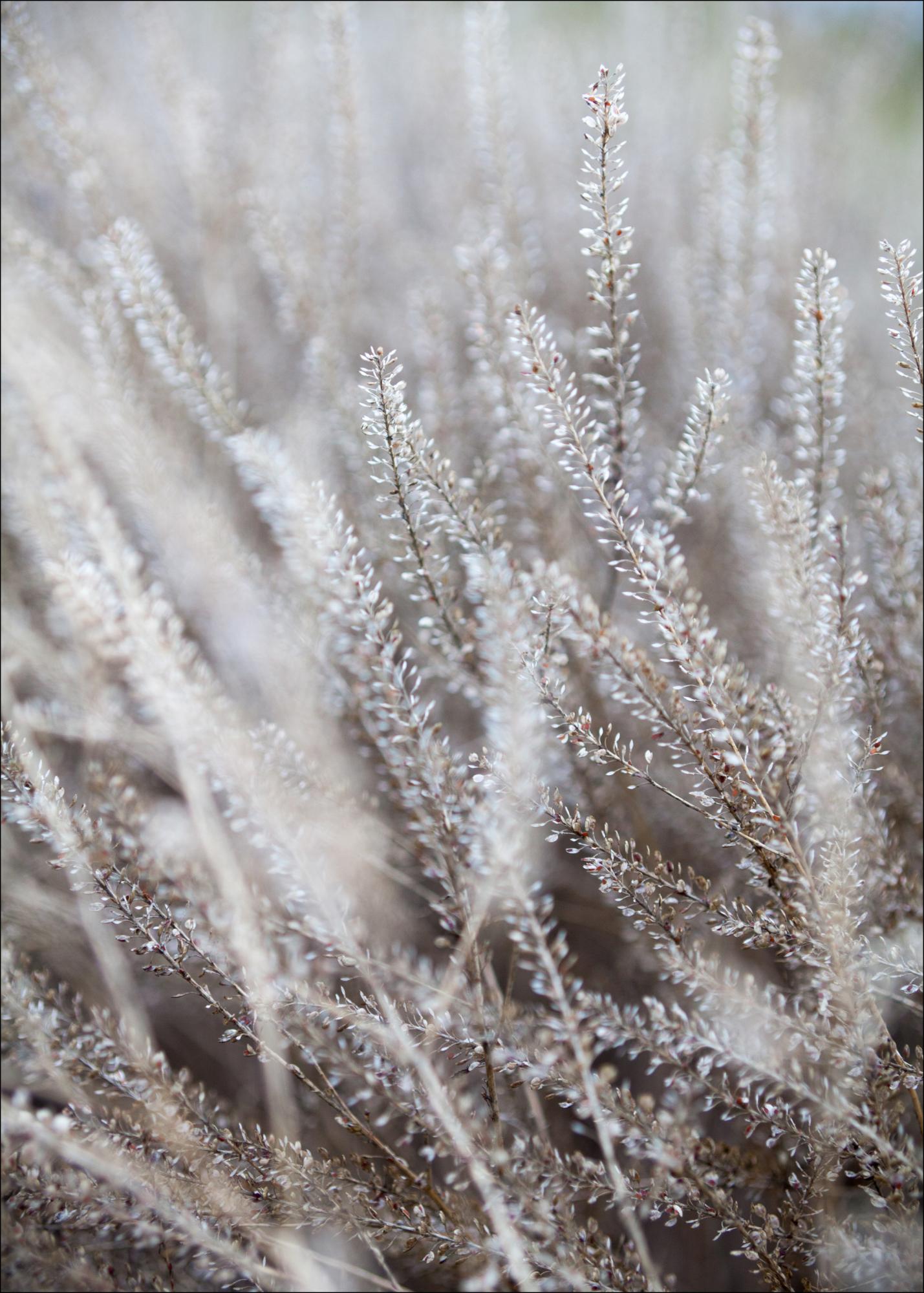 A wintery poster of frosty grass fronds. The delicate grasses are individually captured in this stunning, and rather magical image. The stems stand tall, fading off into the background as the whole field of grass waves gently. Add this to a warm wall to give it a touch of colour.
