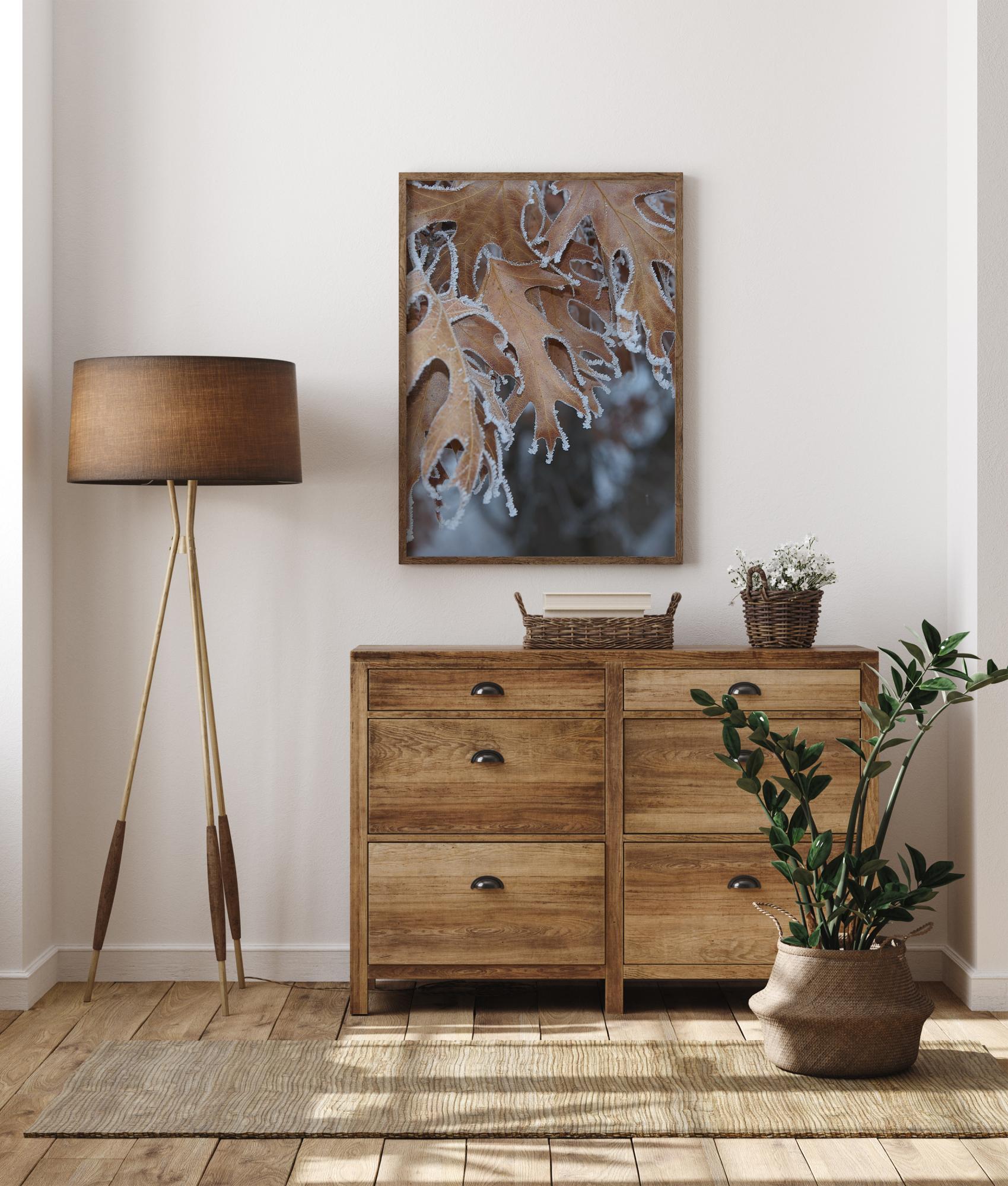 A macro poster of autumnal leaves edged with frost. The brown and russet leaves curl in the cold, each one with a frosting of tiny ice particles creating a decoration of sorts. Feel the icey temperature when you hang this up.