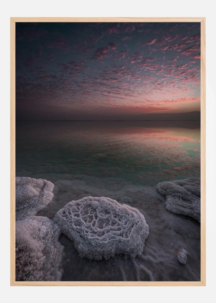 A beautiful poster of a wide open lake. In the foreground, large salt crystals have formed to make stunning natural patterns and designs. The lake stretches into the distance with the night sky a dramatic red and blue, adding to the magical nature of this image.