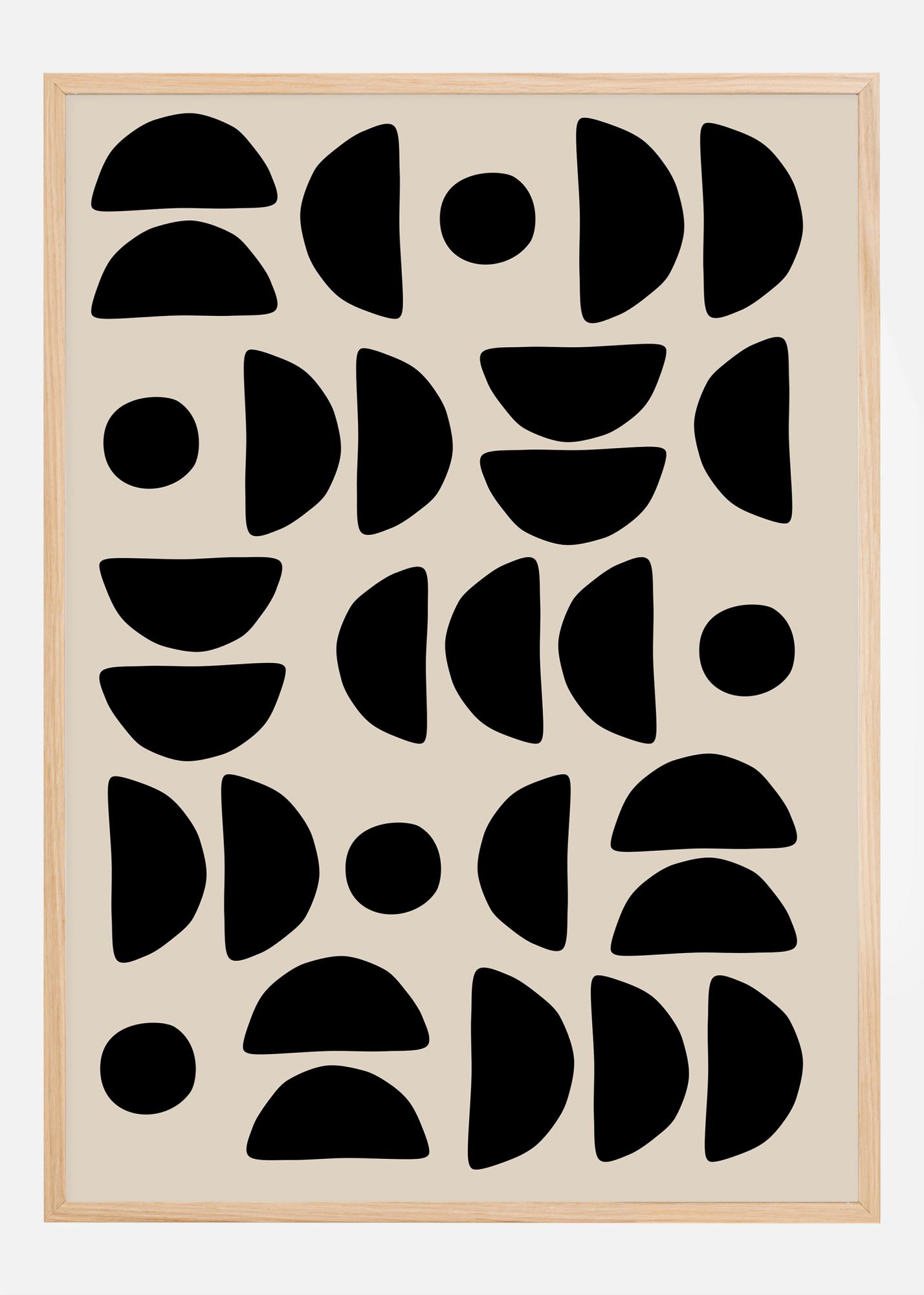 This artistically crafted poster stands out with its bold pattern of geometric shapes in black against a beige background. The abstract design is playful and rhythmic, creating a visual tension that is both modern and timeless. This work can be seen as an homage to both the organic world and the constructed elements within graphic design, and is perfect for those who appreciate art with strong, clean lines and powerful contrasts.