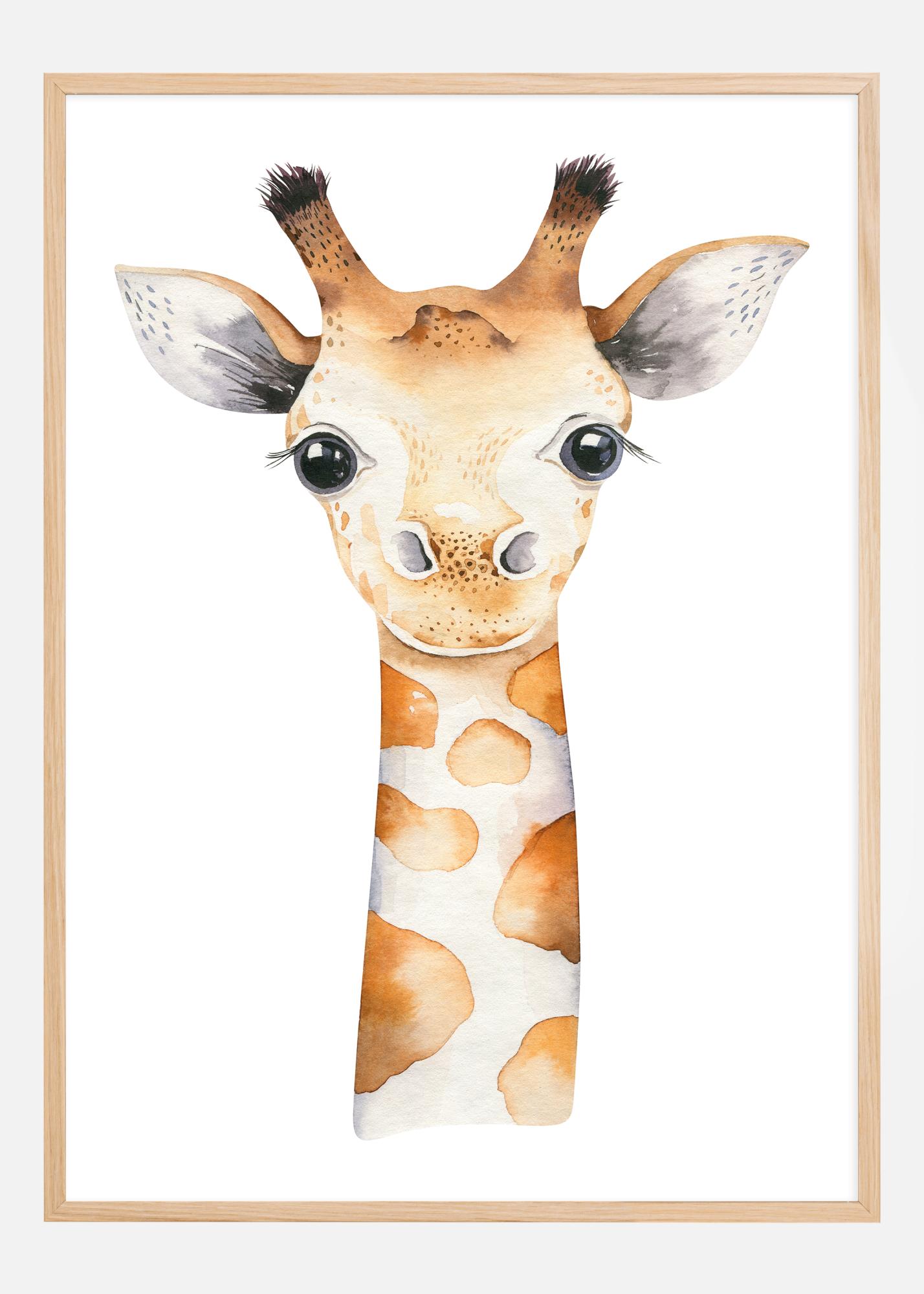 This adorable portrait of a baby giraffe, created in watercolor, is a poster that radiates charm and warmth. With its large, curious eyes and characteristic spots that playfully dance over its long neck, this print brings a sense of joy and playfulness to any space. Its soft colors in beige, brown, and white create a calm yet joyful atmosphere.