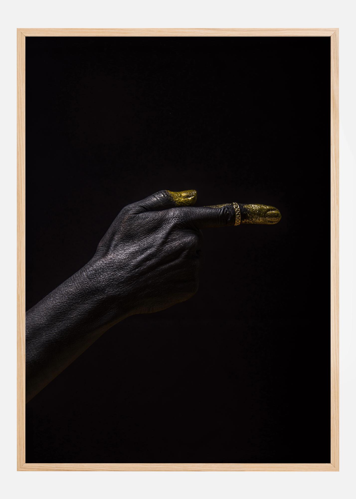 An artistic poster of a hand pointing a finger like a gun. Most of the hand has been painted black, but the fingers are painted gold to the first knuckle. The hand points like a gun to the right of the page, but stands out against the black background. Add this to a cream wall for a truly dramatic look.