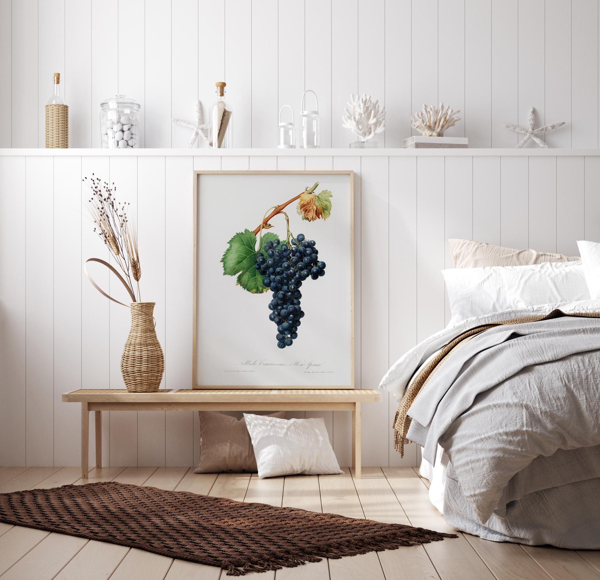 A detailed botanical poster of a bunch of dark black grapes on a vine hanging in the middle of a white background. The glossy black grapes look succulent and juicy and dangle enticingly in the centre of the image. Hang this in your kitchen for some food inspiration.
