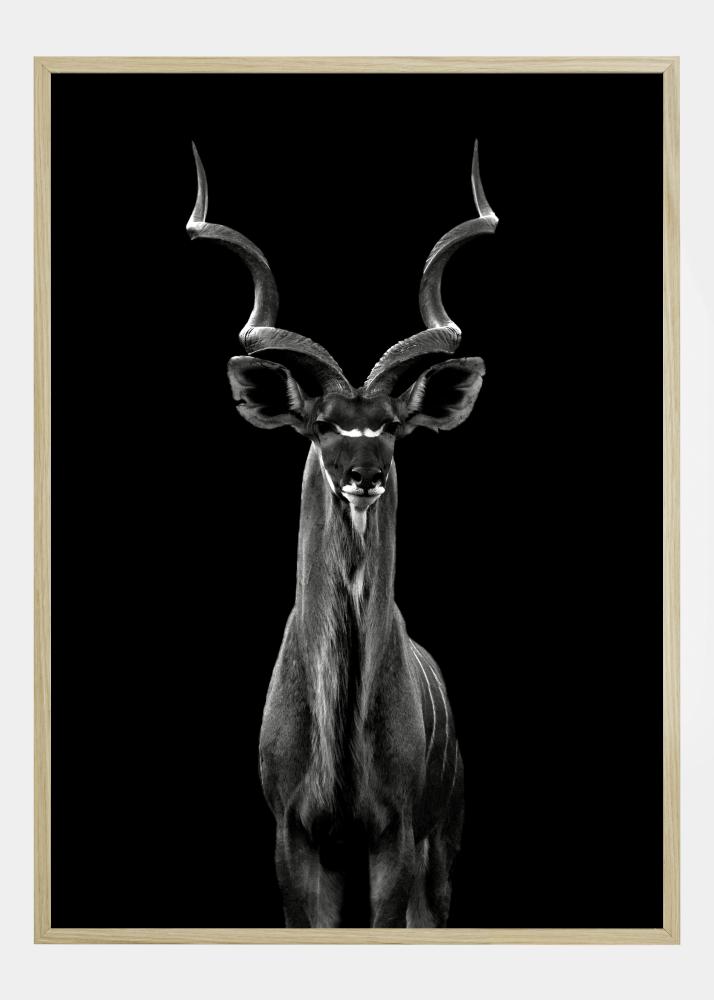 A wildlife poster of a Greater Kudu standing tall against a black background. This majestic antelope stares at the camera, the twisting horns spiralling upward to fill the image. Add this stunning black and white animal portrait to your home for a touch of the magnificent.