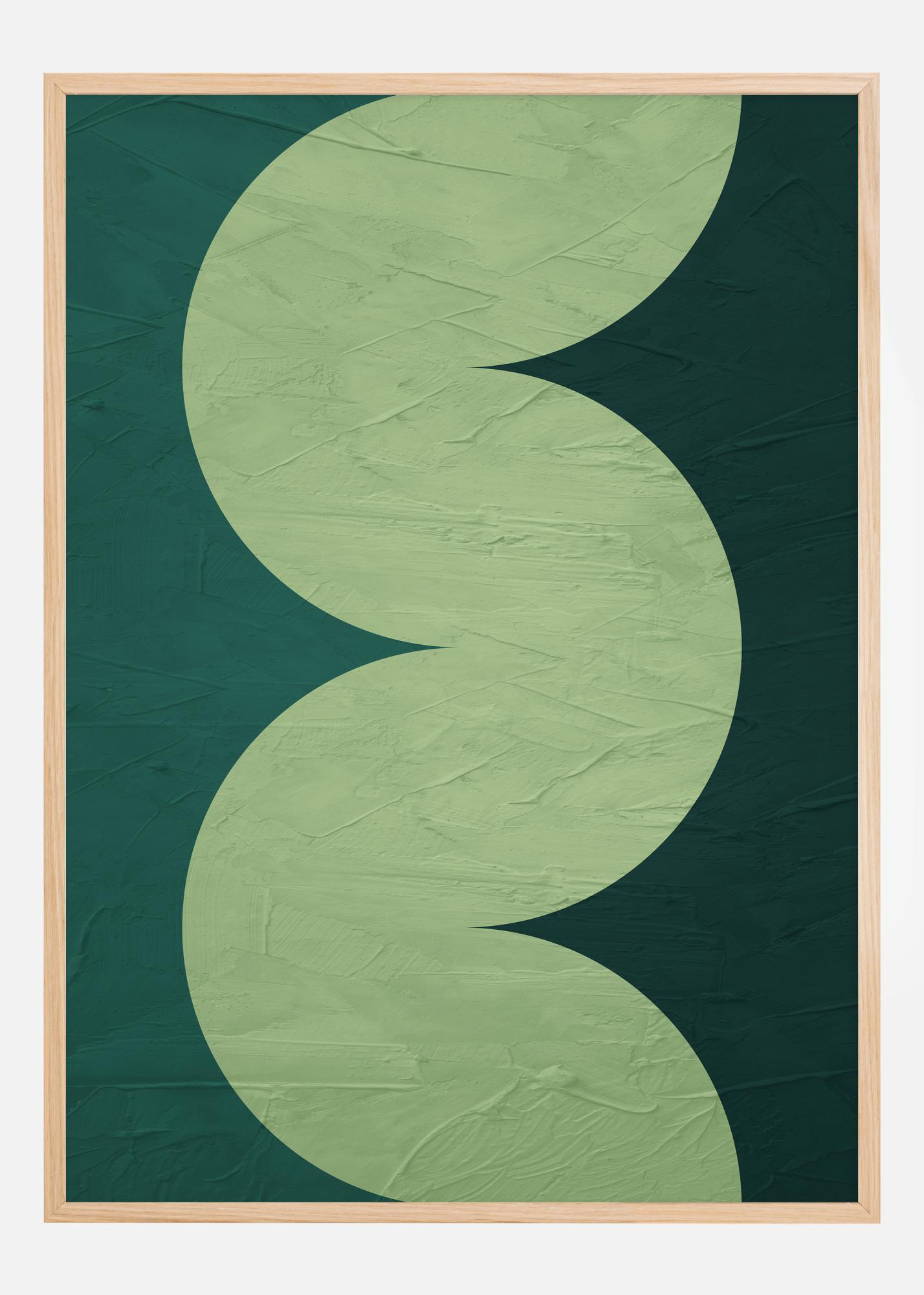 This abstract and artistic poster is characterized by its bold graphic design with sweeping curves that create a playful and dynamic feel. The two green shades, a lighter pastel and a deeper forest tone, complement each other and give a sense of life and vitality. This artwork brings a modern touch and a fresh atmosphere to any room and is a tribute to the natural shades of green that we find in nature.