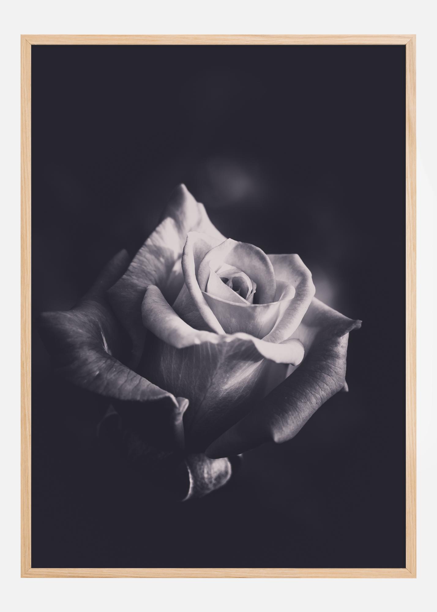 This sophisticated poster captures the essence of beauty in its purest form with a single grayscale rose. Its petals unfold elegantly outward, creating a symmetrical and appealing shape that is both delicate and powerful. The image is deeply detailed, with soft transitions from light to shadow that highlight the natural beauty of the rose's structure.