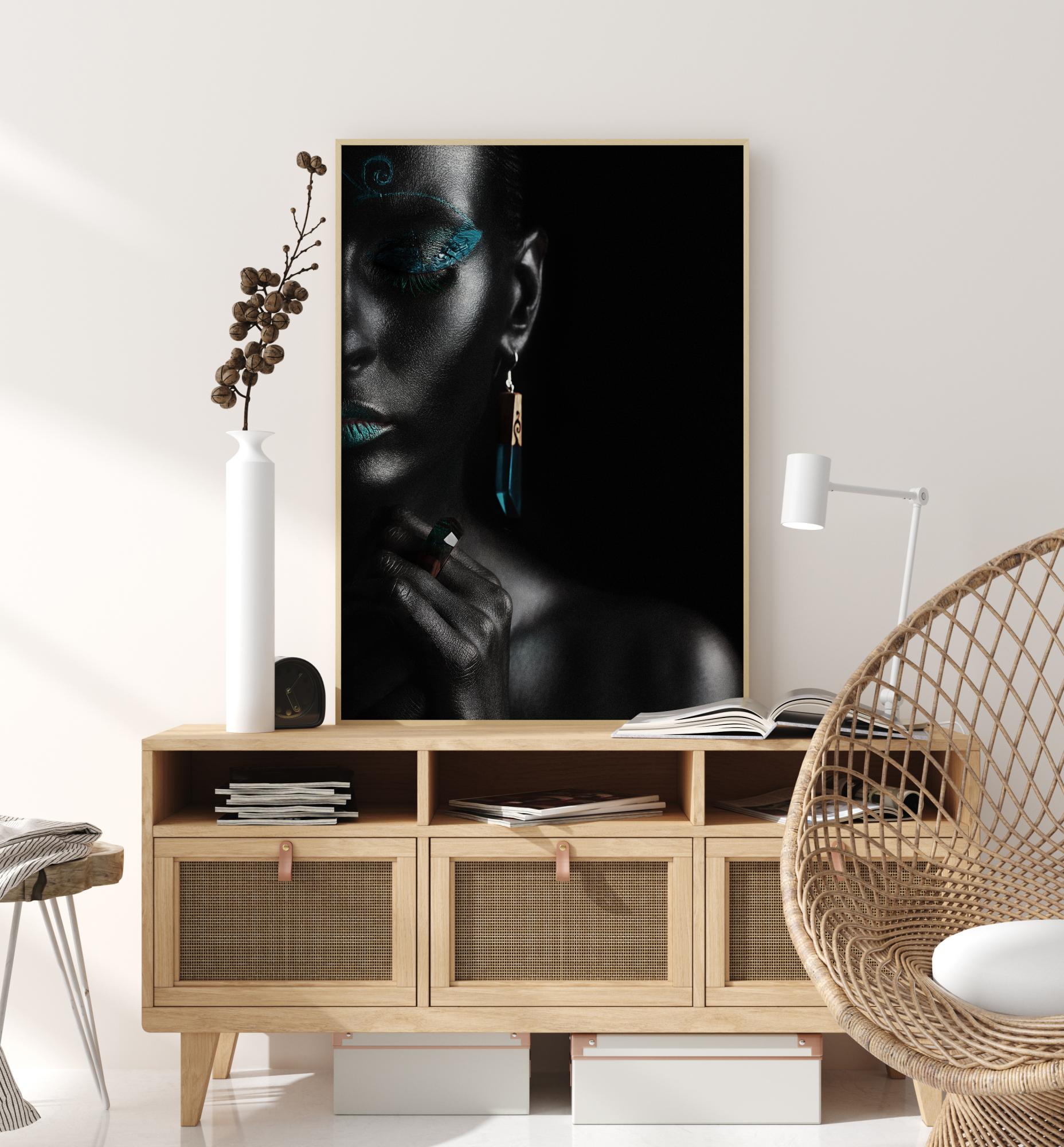 A breathtaking portrait depicting a beautiful woman deep in thought. Painted on a black background, the woman's eyes and mouth are highlighed in a deep turquiose green. The light from the window shines on the woman's face. The light captures all the details making this a perfect portrait for a bare white wall.