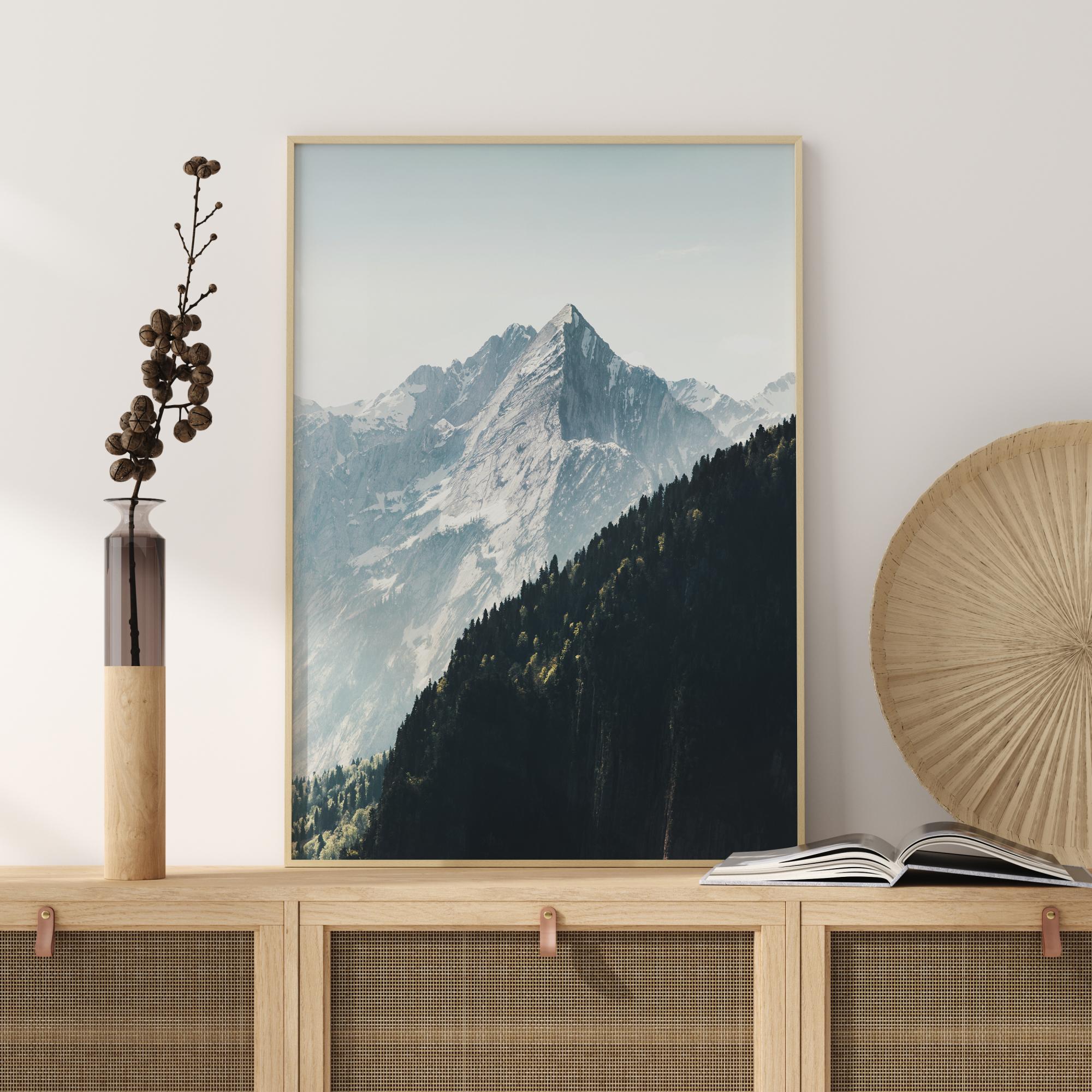 A scenic landscape setting with snow covered mountains against a pale blue sky. In the foreground a dark green forest partially covers the view of the mountains creating a beautiful winter atmosphere. A perfect print to hang above your fireplace.