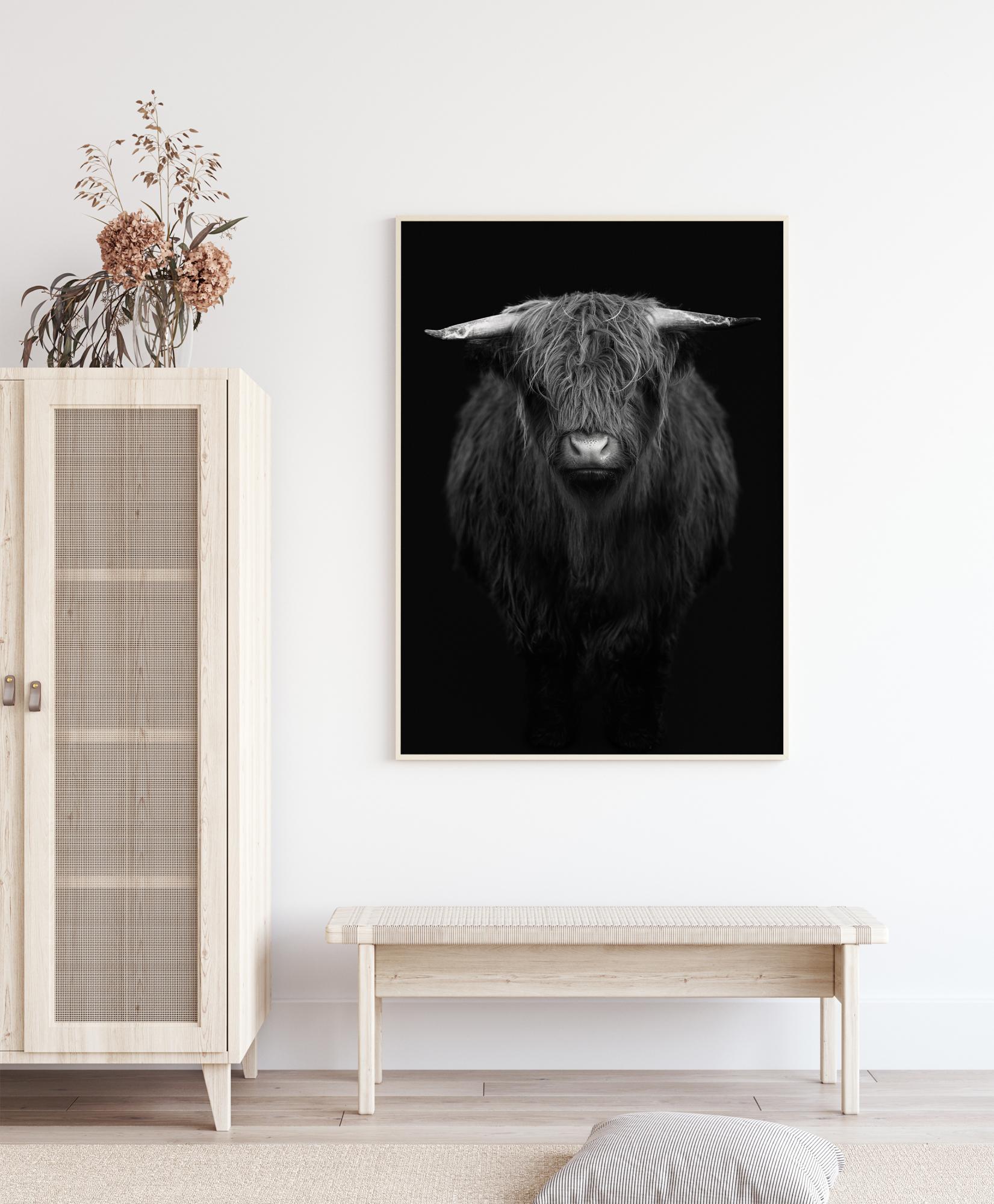 An impressive black Highland Cow on a black background. Looking straight into the camera, this beautiful creature shows off his long black wavy coat. Although this print is a black on black image, the cow's white horns and nose stand out considerably. Admire the beauty of this creature as he stares into the camera.