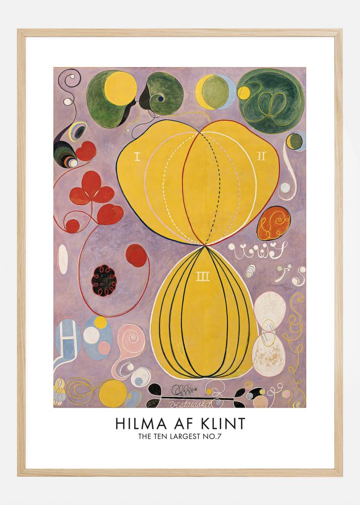 This poster, presenting 'The Ten Largest No.7' by Hilma af Klint, is a true feast for the eyes, filled with playful shapes and bold colors. Central to the piece is a large yellow figure, divided into three sections, surrounded by a symphony of curves, circles, and spirals in a spectrum of red, green, and blue. The abstract forms and occult elements on a purple background make this artwork a mystical and meditative experience. This art print offers a unique combination of aesthetics and philosophy, reflecting af Klint's ambition to link the physical with the spiritual.