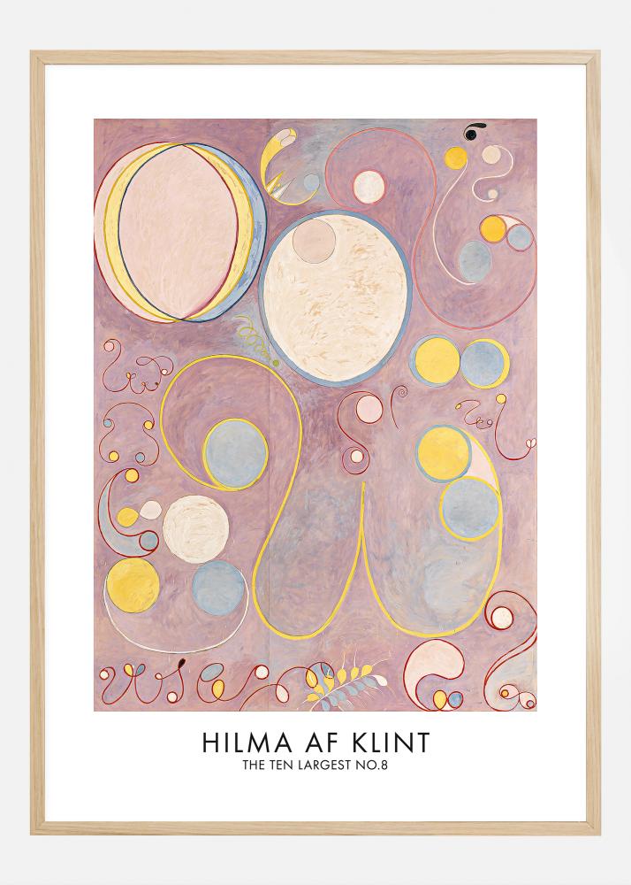 This poster shows 'The Ten Largest No.8', a part of Hilma af Klint's remarkable work that explores spiritual dimensions through abstract art. This delicate composition utilizes soft pastel colors and flowing shapes to create a sense of harmony and universal balance. The overlapping circular shapes and spirals, highlighted by lines in warm red and yellow against a calming pink background, emit an enveloping calm and reflective atmosphere. This print is a fantastic representation of af Klint's bold and timeless vision, and would be an inspiring and meditative addition to any space.