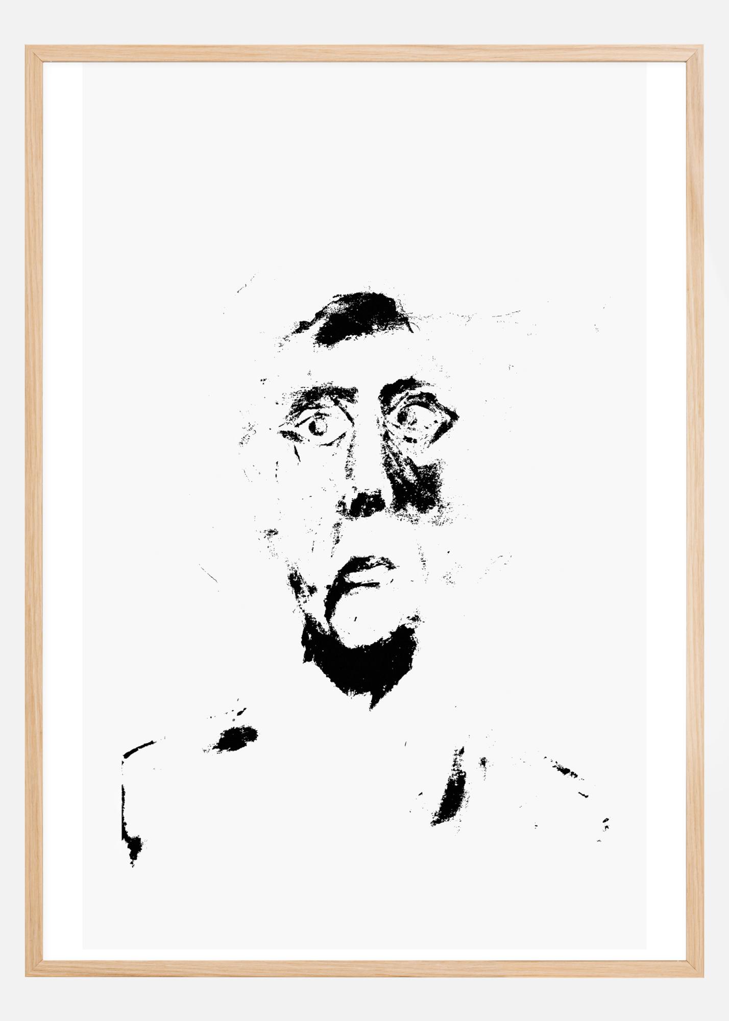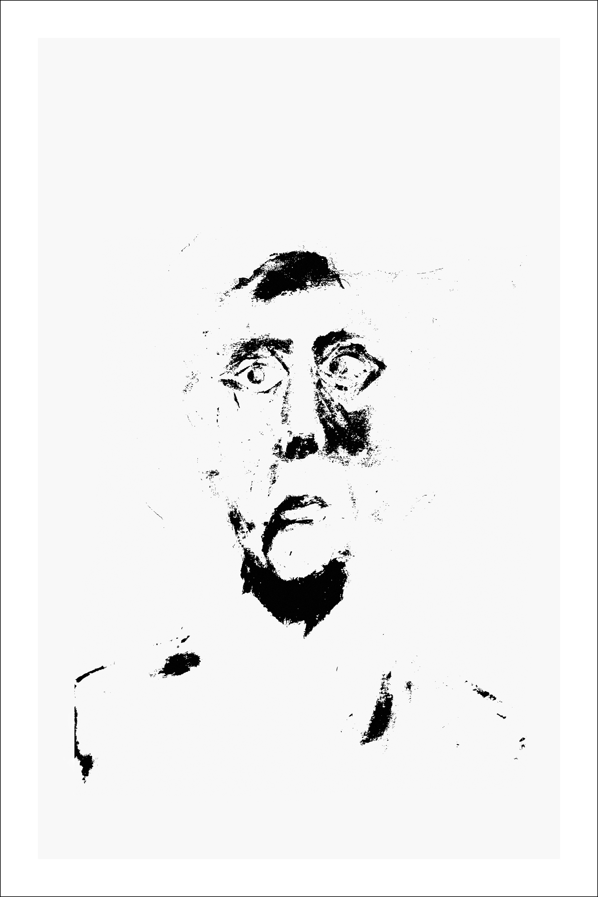 An eerie black and white head and shoulders portrait. Set on a white backdrop, the dark shades enhance the figure's hair, cheek and neck. The figure's wide eyes express fear and mystery. A sad and eerie print that transmits fear.
