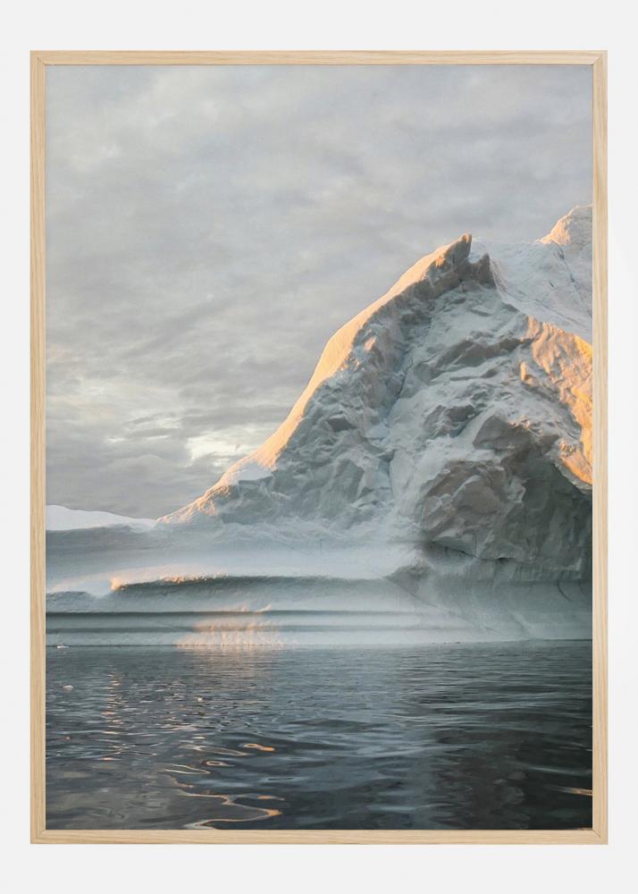 This breath-taking iceberg print reflects in the deep, cold sea against a cloudy grey sky. The small snow-capped mountain is partially illuminated by the sunlight. The crystal blue sea ripples gently in the foreground, creating a peaceful image. An ideal print to hang in your winter chalet over the fireplace.