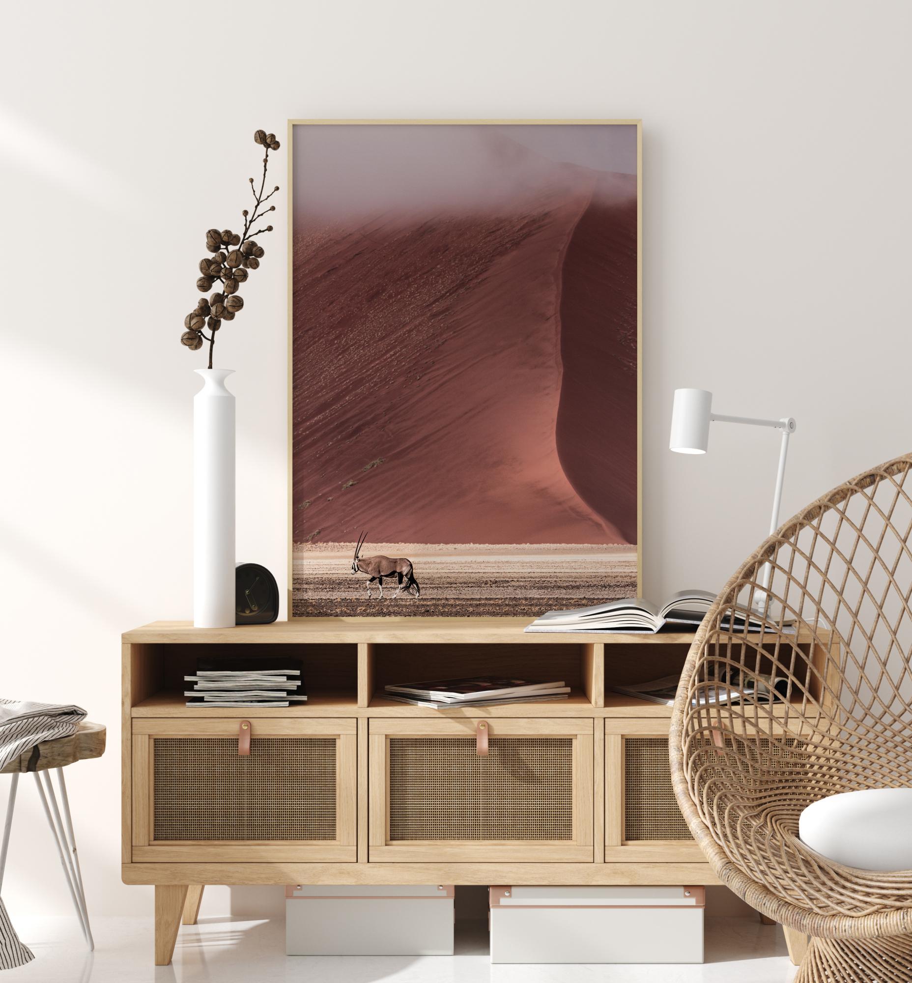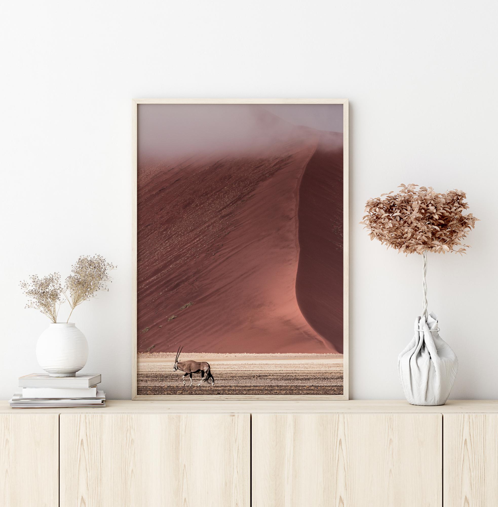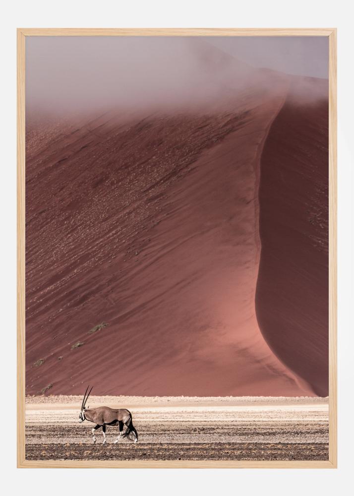 A simple poster of a tired Gazella crossing the desert. In the background, an impressive red dune meets the sandy ground at the bottom of the print. The beautiful colours start to fade, as the desert fog falls. Set on a cream background, these soothing colours create a beautiful nature scene.