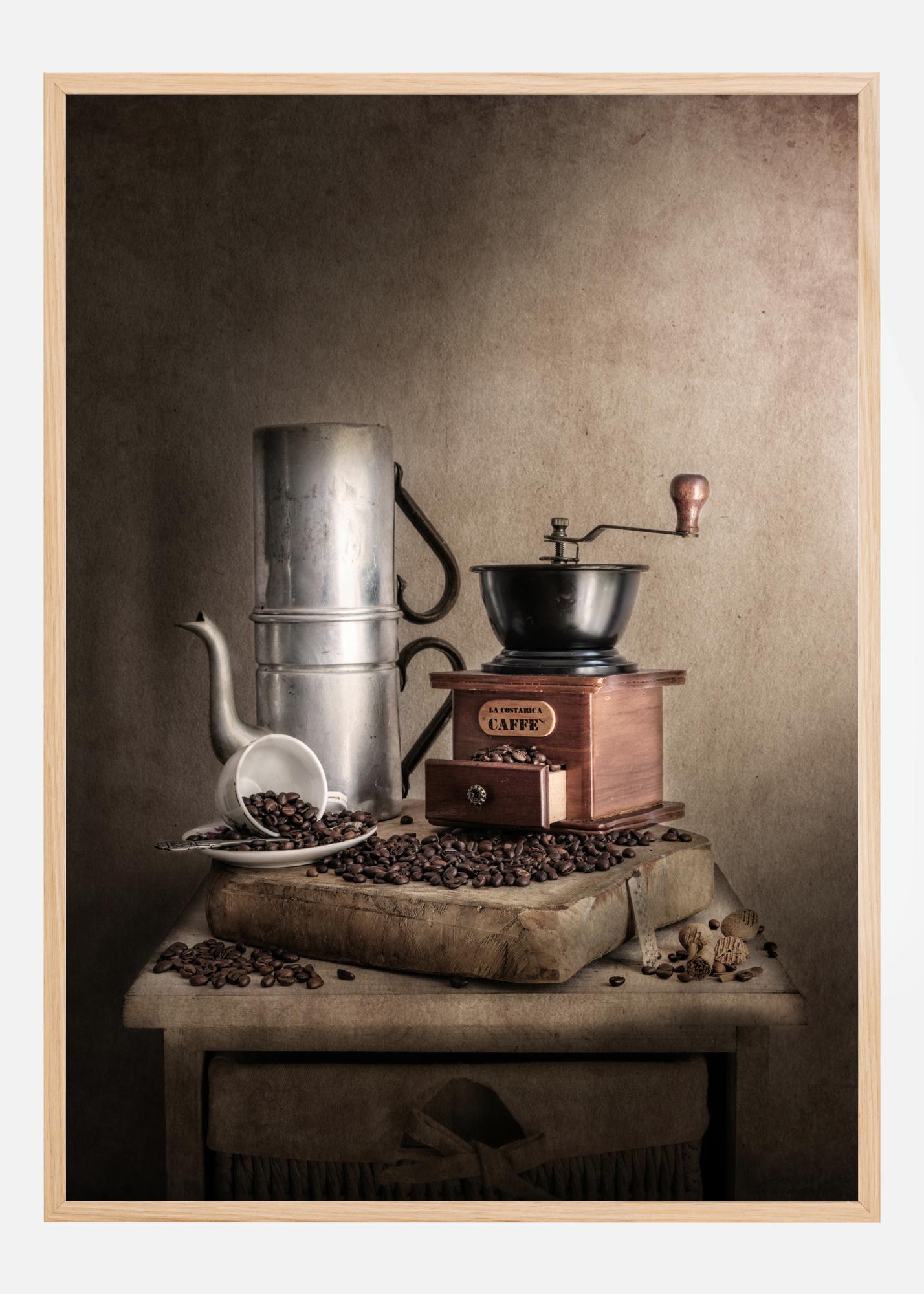 A coffee-themed print featuring a coffee grinder, a coffee pot, coffee beans and a white cup and saucer. The soft brown tones in this print create a relaxing image where you can almost smell the wonderful roasted coffee beans. The perfect picture to hang in a kitchen.