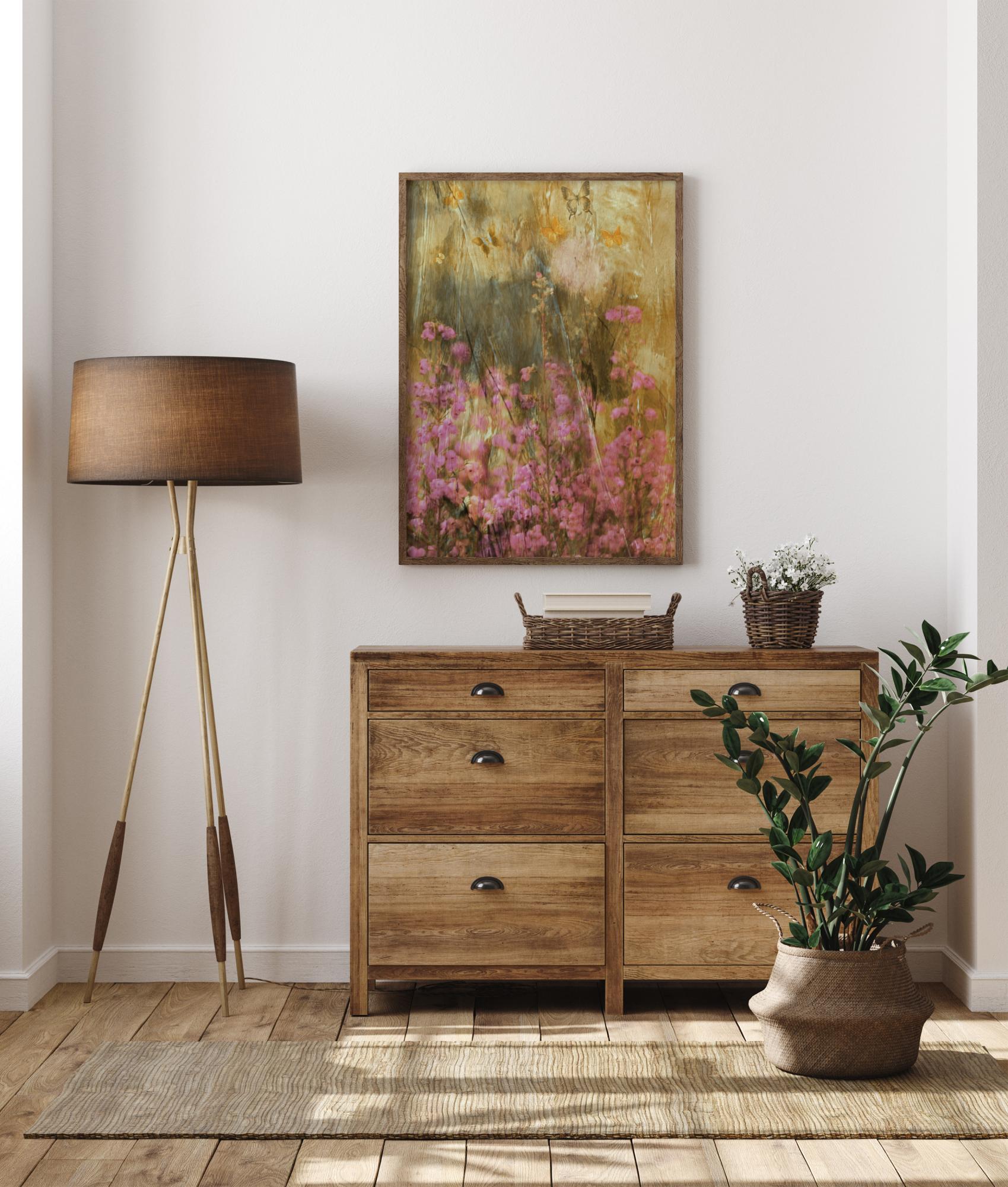 A beautiful springtime nature print of pink and brown dried grasses in a field. The soft pastel colours convey a relaxing, peaceful tone. The soft, pink, pastel flowers fill the image, with the beautiful brown butterflies hovering in the background. A delightful print for any room of the house to appreciate nature.