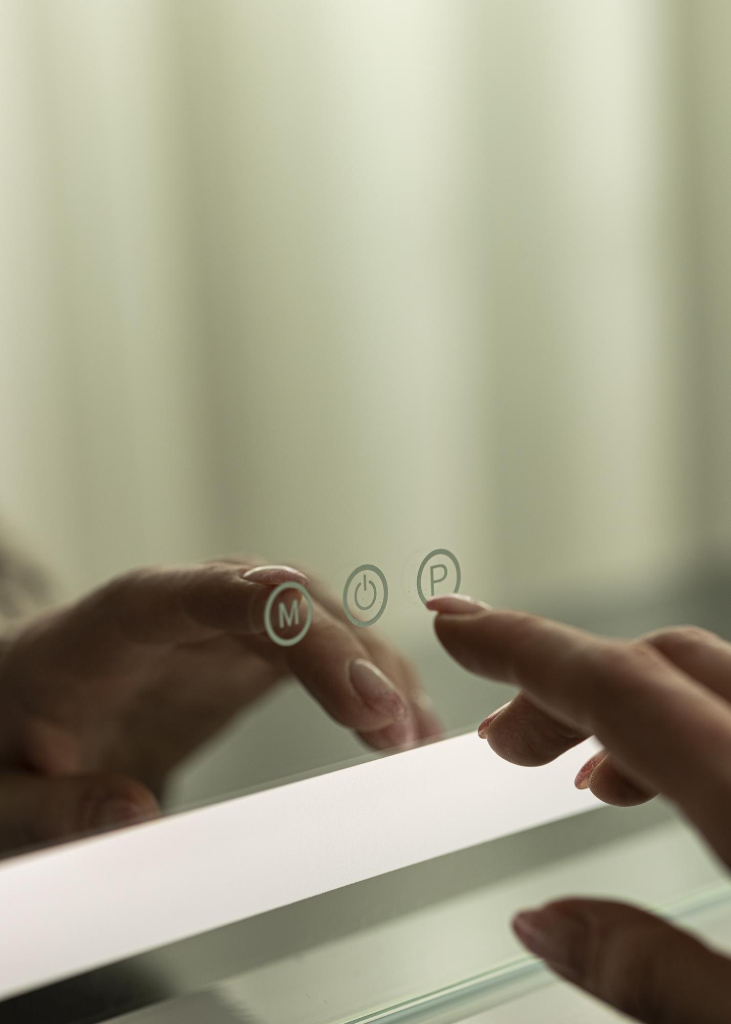 The mirror has a pleasant glow of between 3000K-6000K. The lighting can be easily turned on using the integrated touch button on the front of the mirror. There are also touch buttons for adjusting brightness and colour temperature. The button marked “M” sets the colour temperature and the button marked “P” adjusts the brightness. This mirror is powered using a plug.