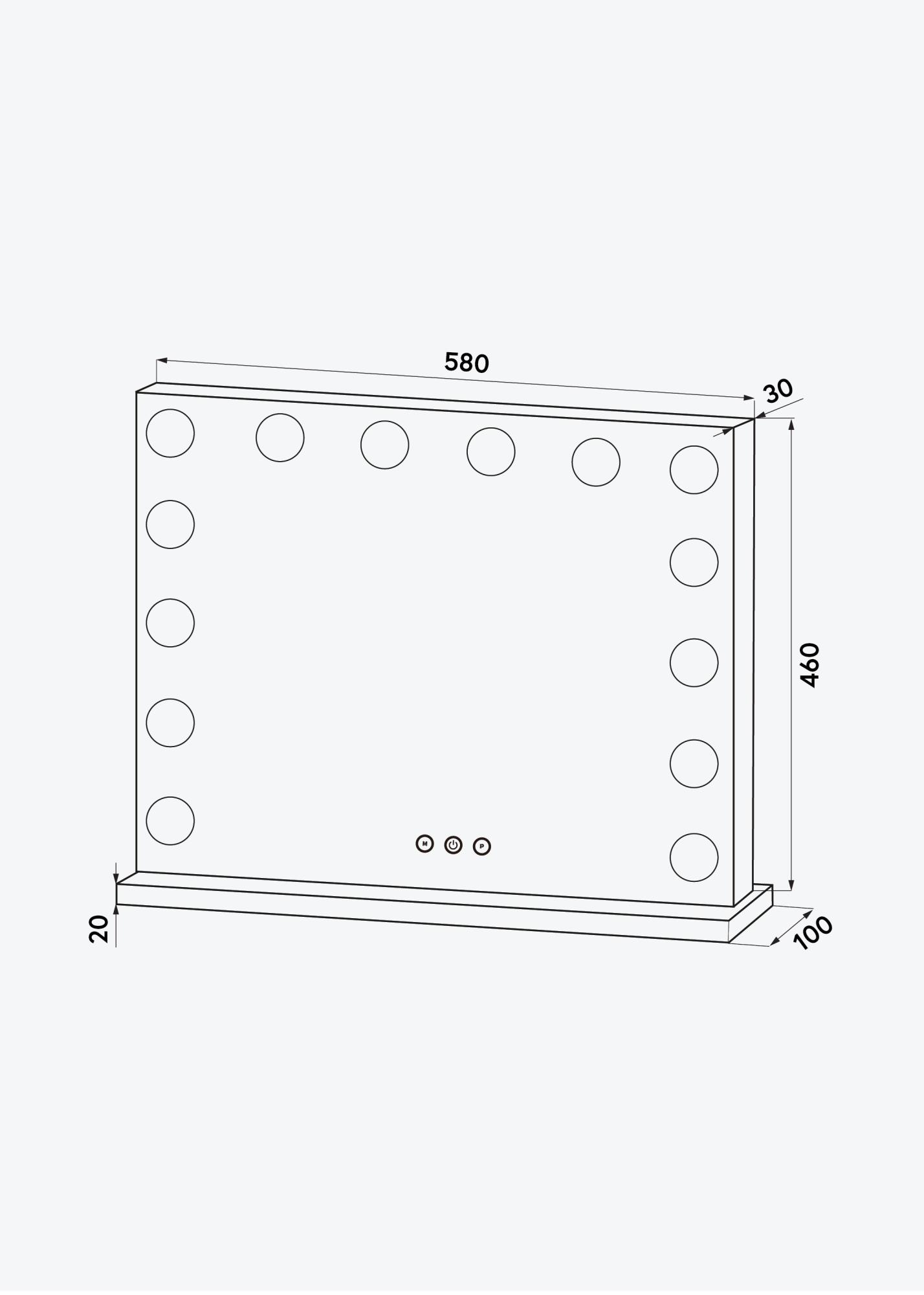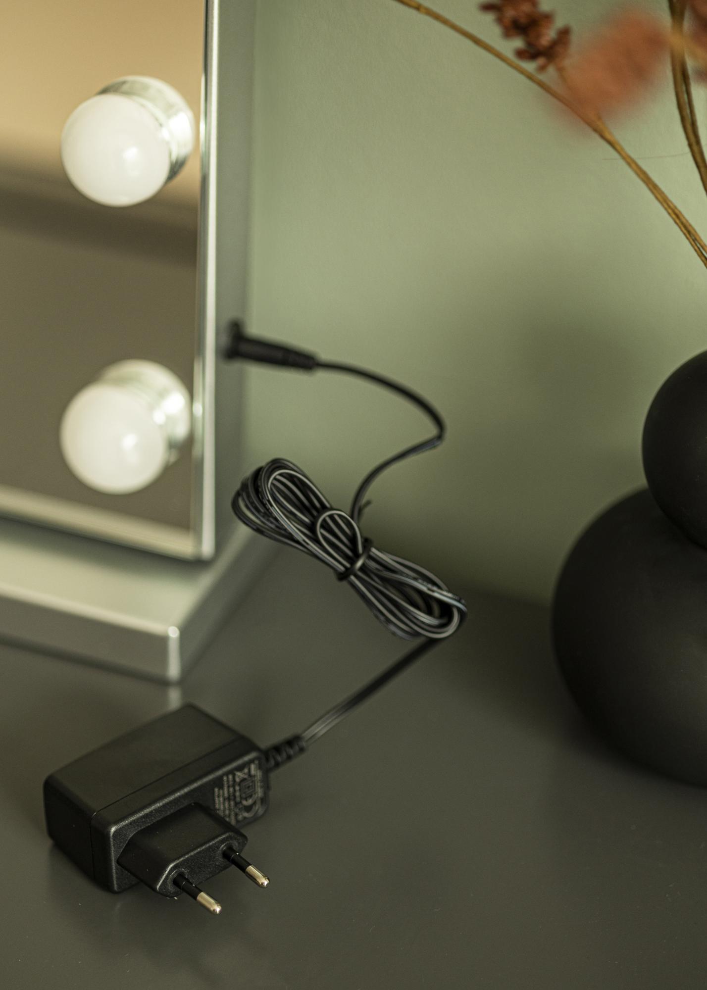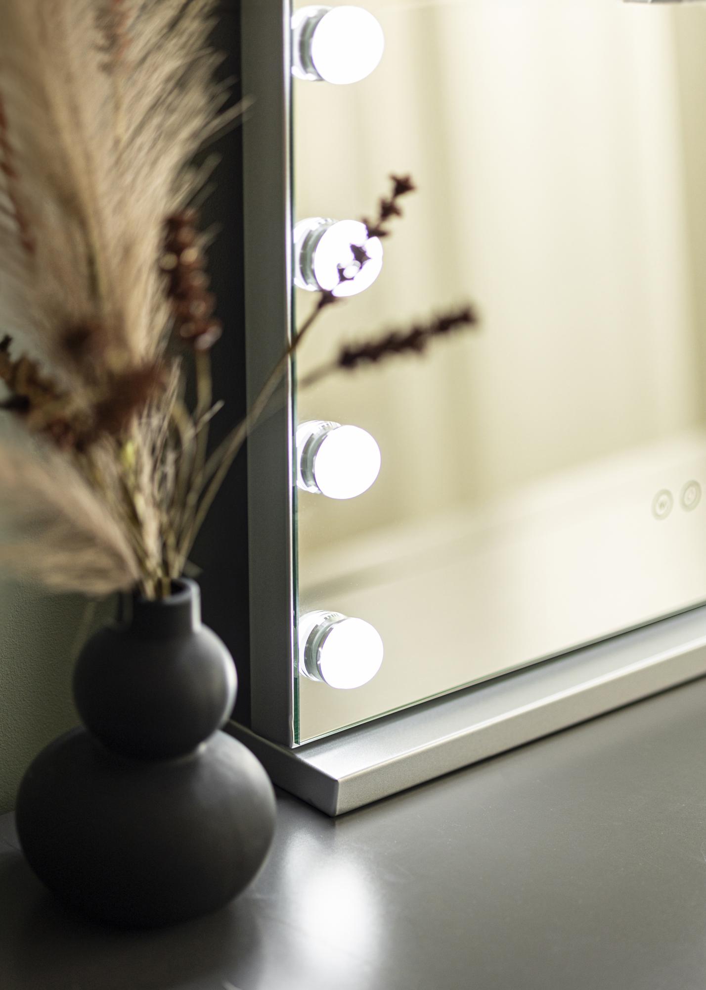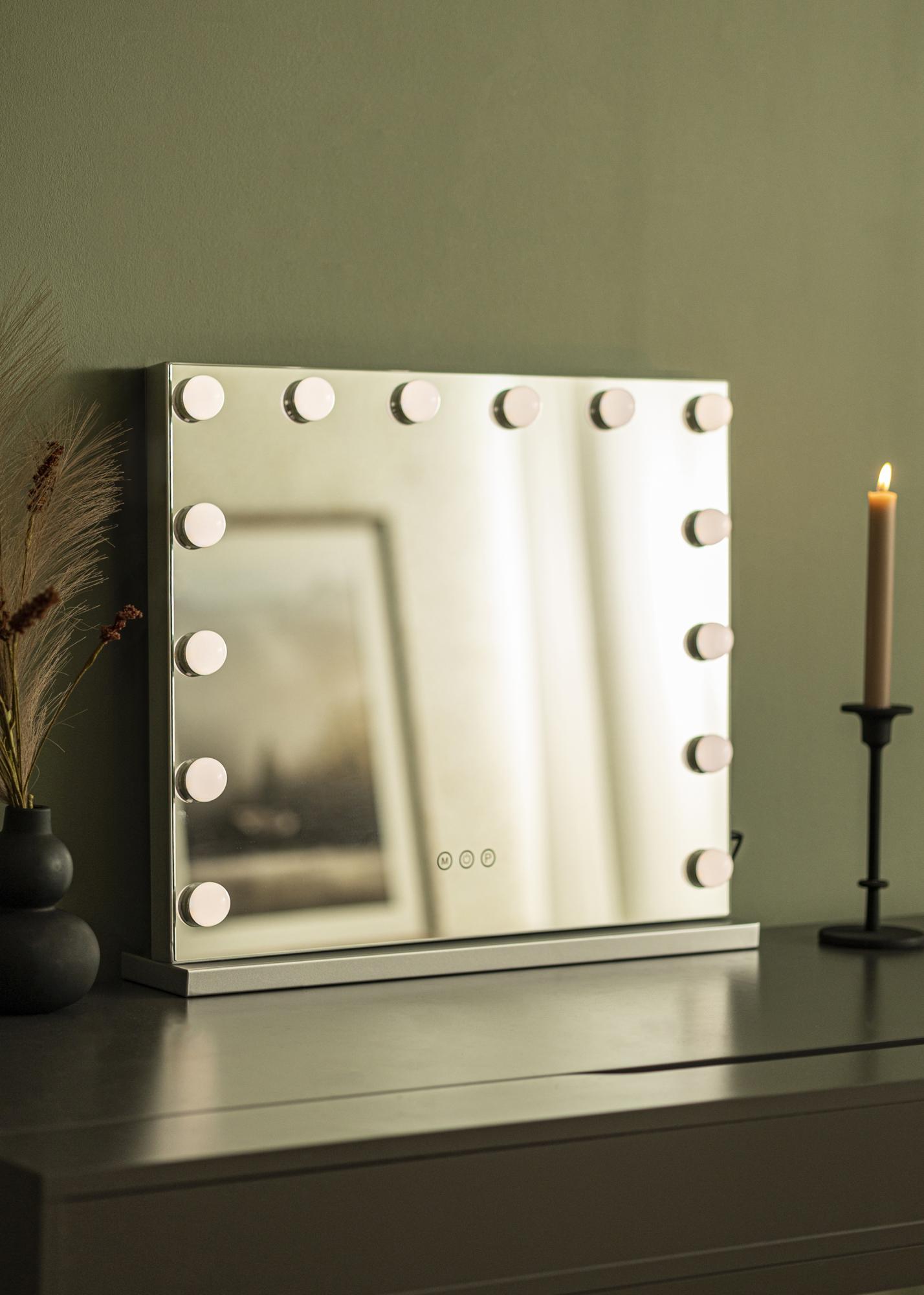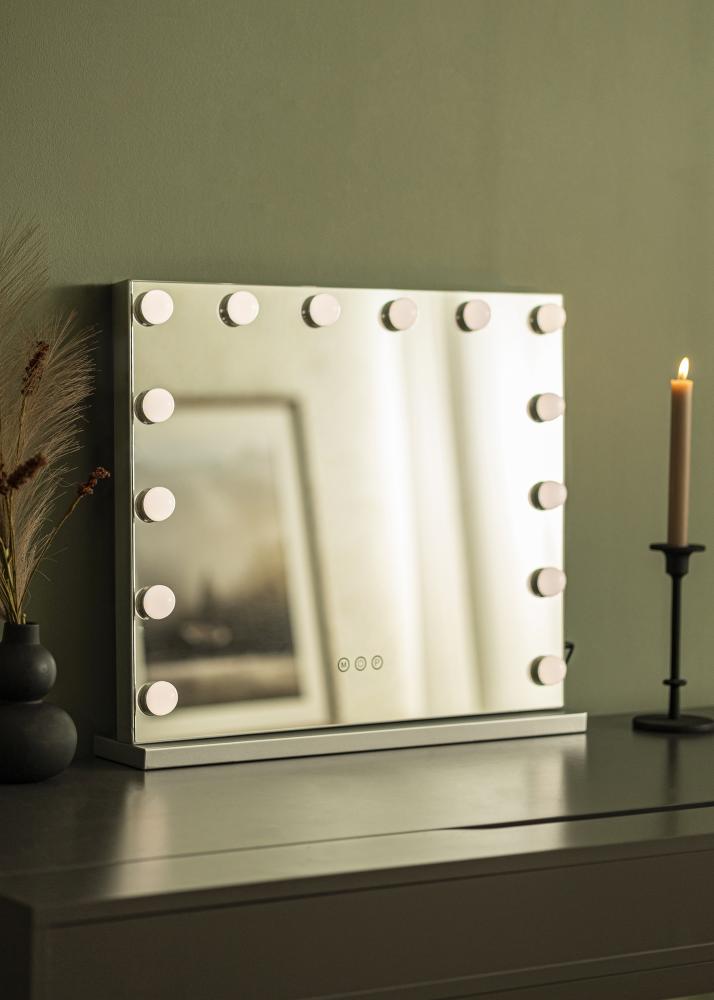 This makeup mirror has an elegant design, with a timeless rectangular shape and 14 LED lights that provide you with good lighting when you apply your makeup. The lights are placed like a frame around the 56x46 cm mirror surface. The light can be dimmed and you can also set the colour temperature you desire. To dim the light, keep pressing the touch button marked with "P" and to adjust the colour temperature between 3000K-6000K, keep pressing the button marked with "M". The mirror also has a touch button to turn the lighting on and off. Electrical connection is made with a plug.
