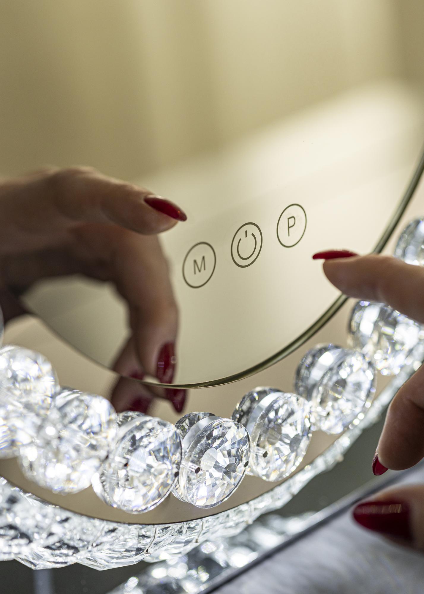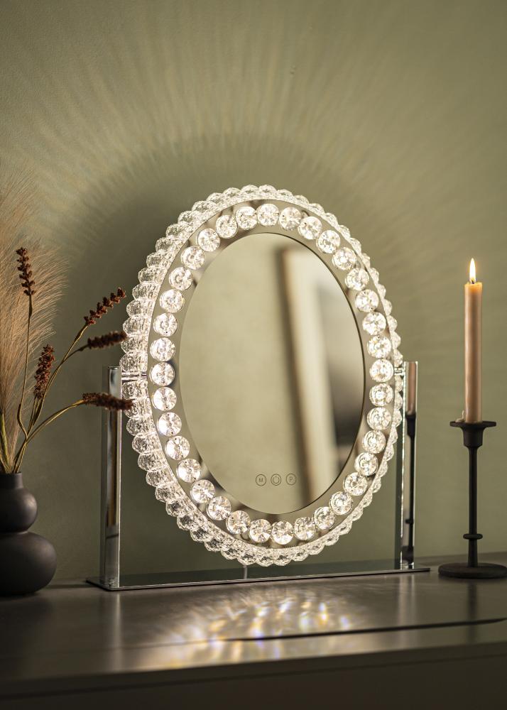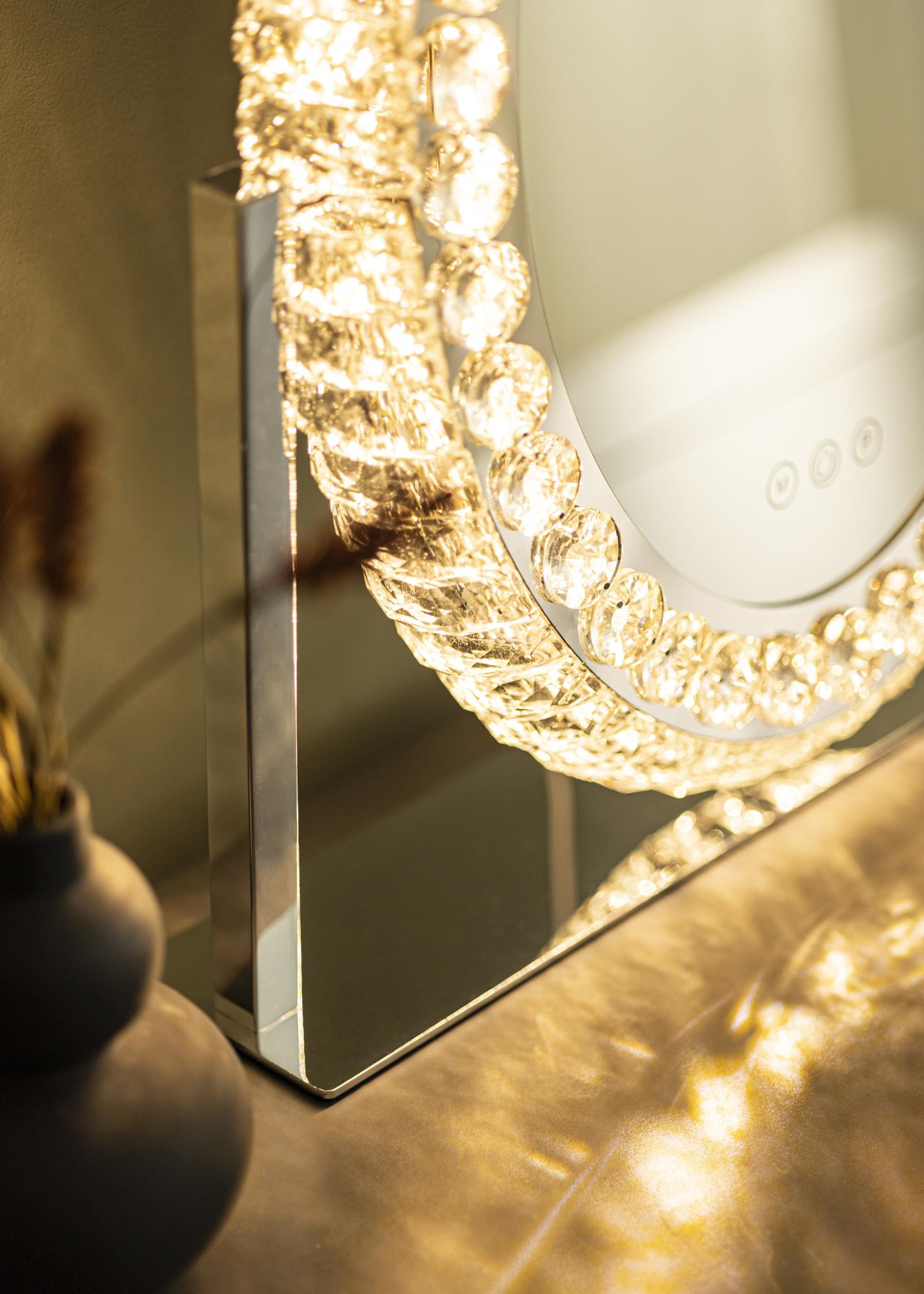 This is a makeup mirror in classic style, with decorative frame and LED lighting. The mirror's oval shape and frame with crystal-like decorations give it a luxurious appearance that fits well in both bedrooms and living rooms. It is made of stainless steel and has a standing design.