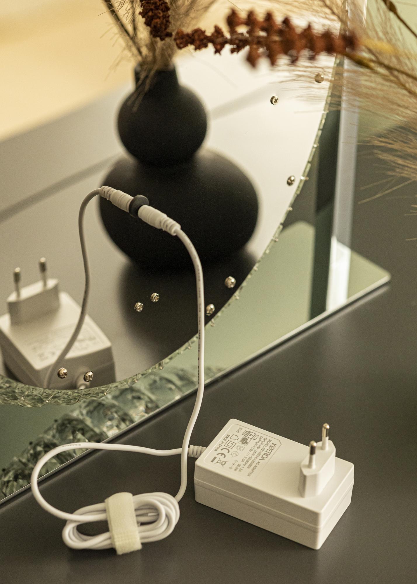The built-in LED lighting provides a pleasant glow – perfect when you're applying makeup and getting ready for the day. You can also adjust the light using the touch buttons on the lower edge of the mirror. With the "M" button, you can change the lighting's colour temperature, and with the "P" button, you can dim the light to the desired strength. There is also an on/off button to turn the mirror's lighting on and off. The electrical connection is made with a plug.