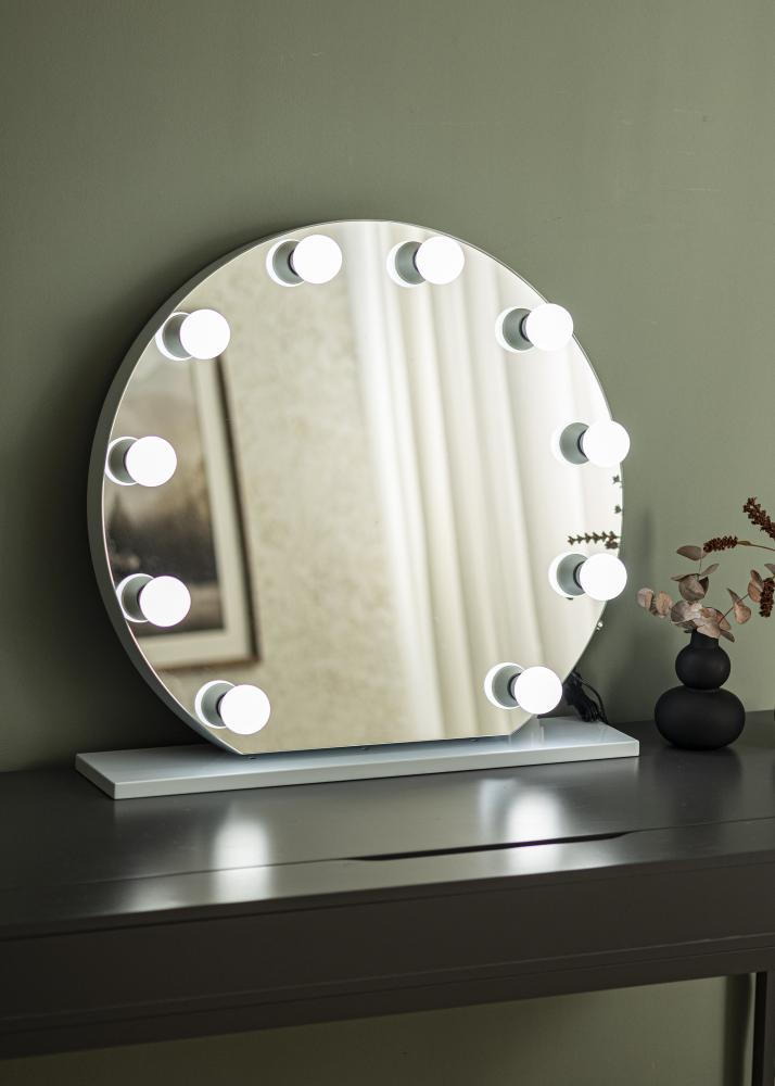 An elegant mirror with lighting can make any room feel more alive. This mirror has a 70x65 cm large mirror surface framed by 10 LED bulbs, giving the mirror its unique and stylish appearance. The LED bulbs are of the model with an E27 socket and can be replaced. The lighting provides a cool white light and with the help of a rotary knob on one edge of the mirror, you can easily dim the light to the strength you prefer.