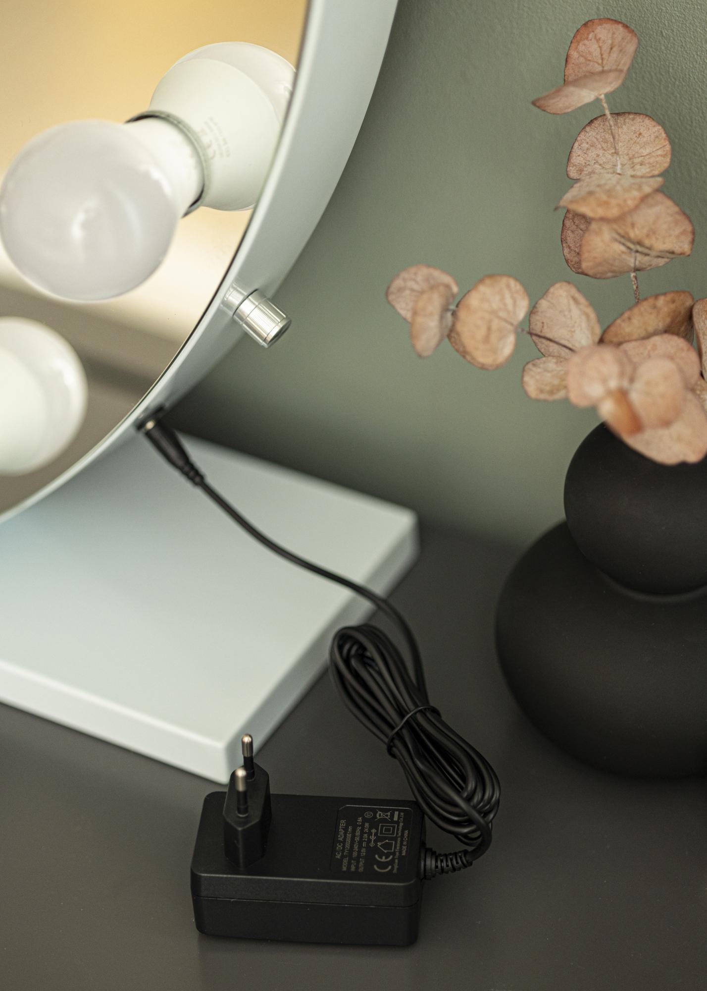 This makeup mirror has a rounded shape that helps to create dynamics in rooms with many sharp edges. You can choose whether you want to place the mirror in a standing position or remove the foot and hang the mirror on the wall. Electrical connection is made with a plug.