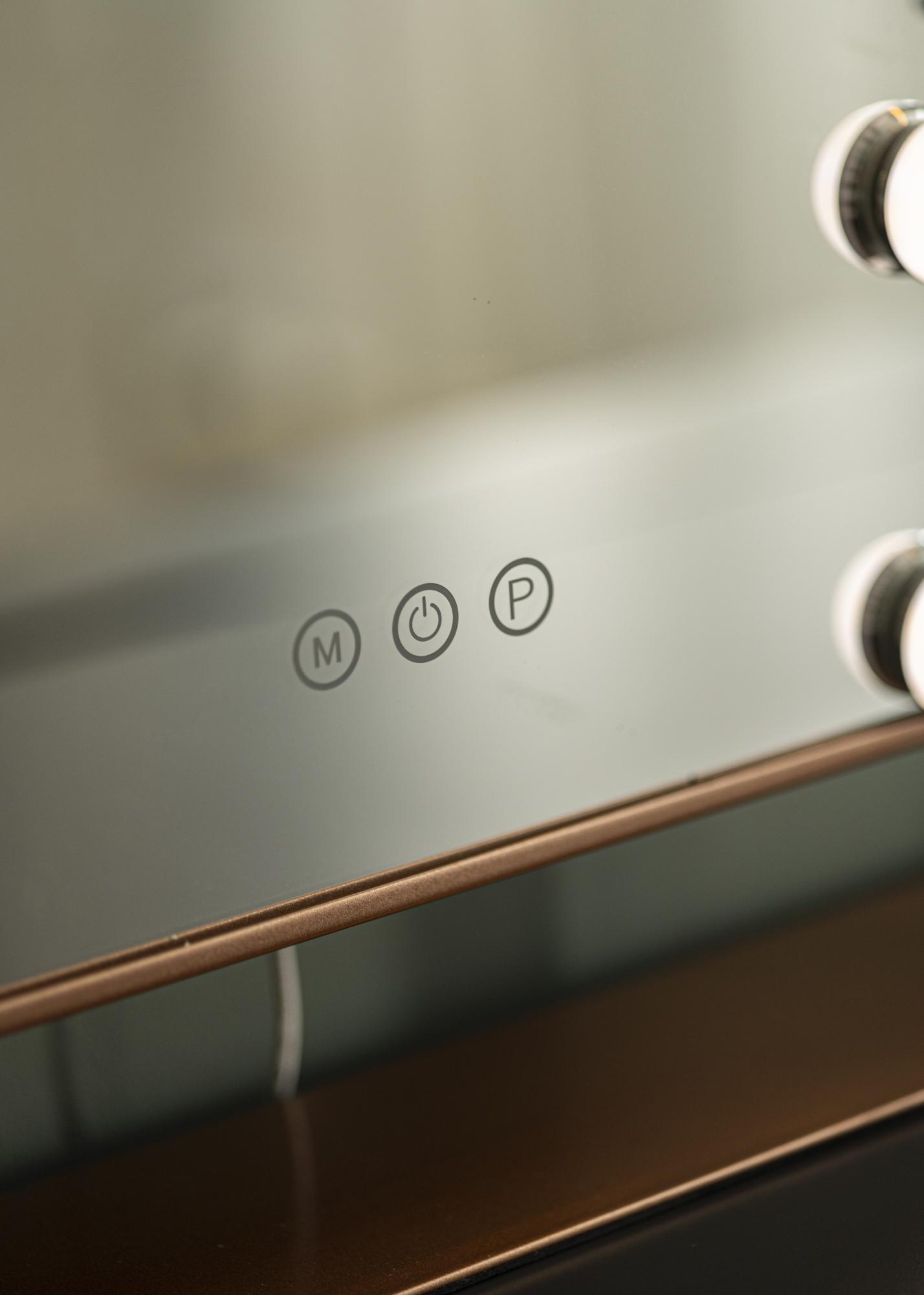 This mirror has LED lighting in the form of 12 large lights positioned beautifully around edges. The lights are activated using one of the touch buttons on the front of the mirror. There are also touch buttons for adjusting the brightness and colour temperature. The button marked “M” sets the colour temperature and the button marked “P” adjusts the brightness. The mirror is powered using a plug.