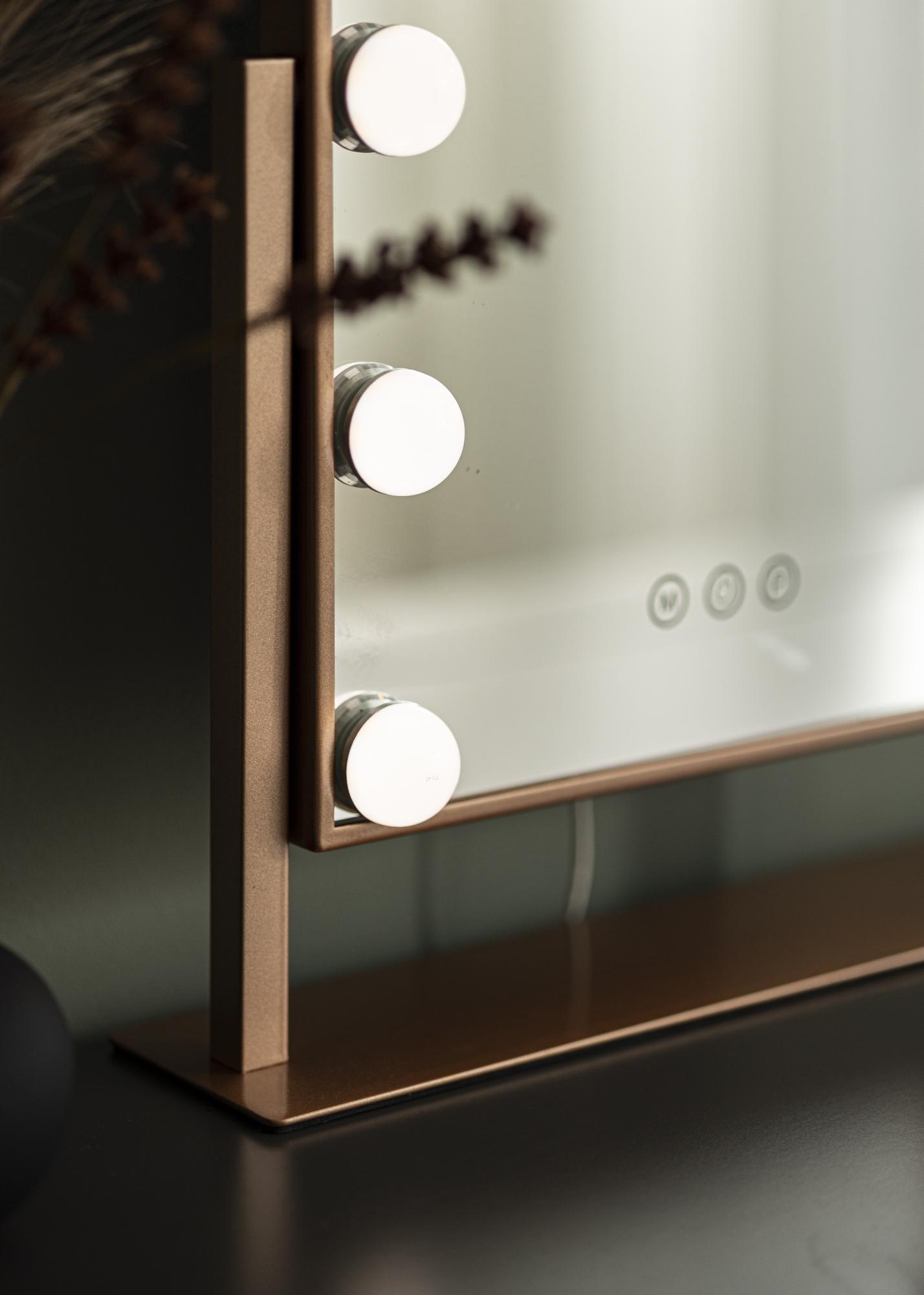 This is a lovely 30x41 cm makeup mirror with integrated lighting in an elegant shade of rose gold. The mirror has an elegant stand so you can easily place it on a dressing table, sideboard or side table. To make using your mirror even easier, you can also tilt it to whatever angle you need.
