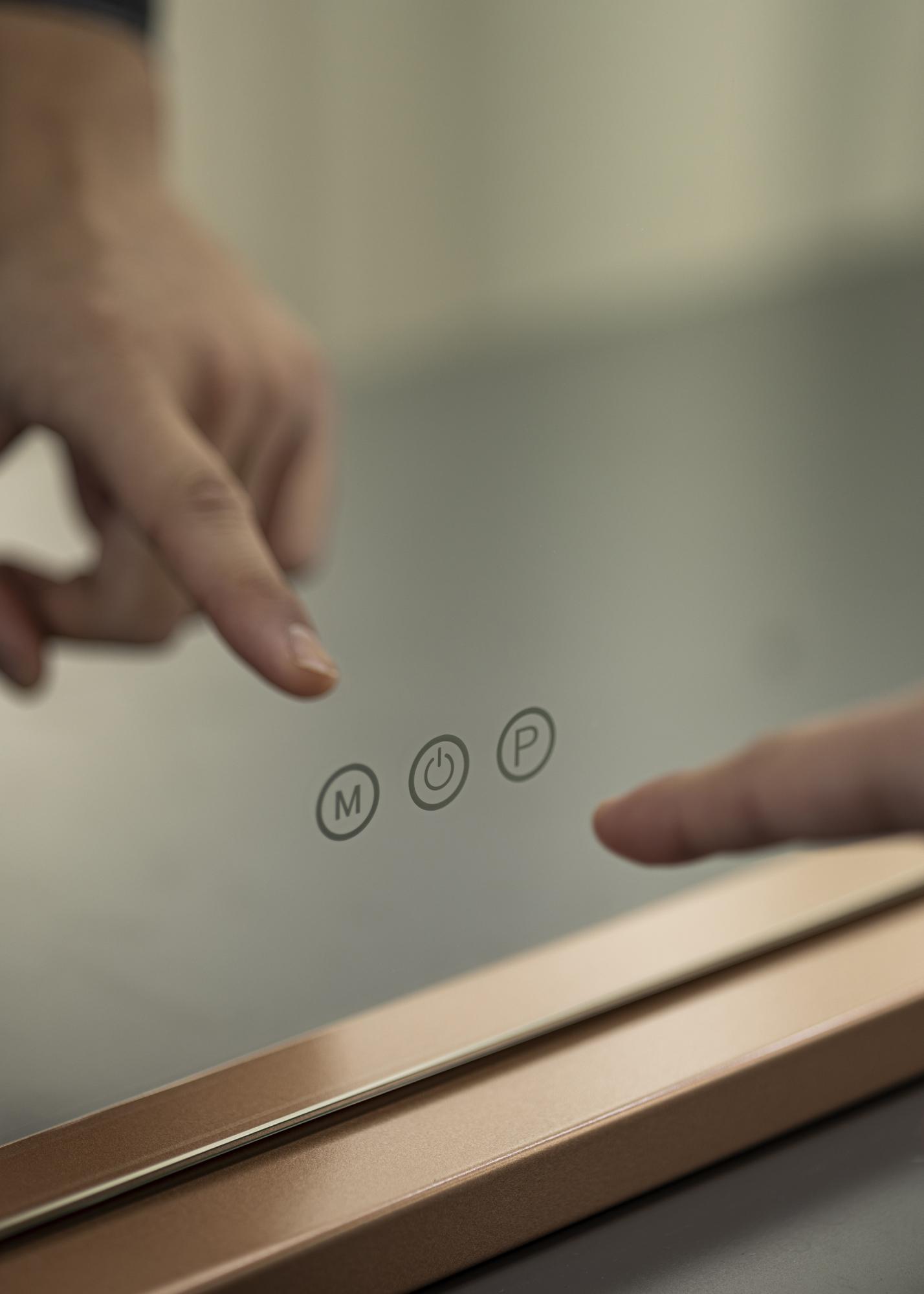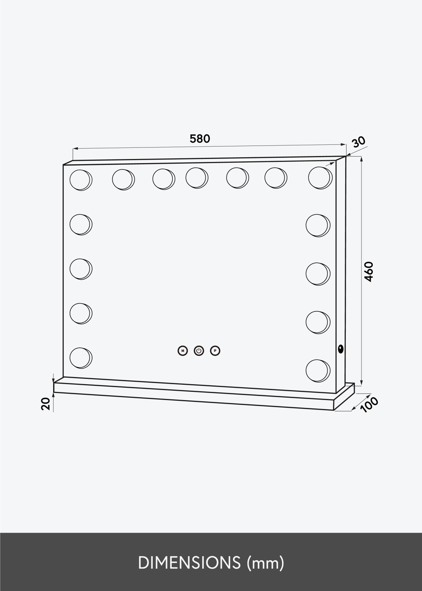 The makeup mirror's reflective surface measures 58x46 cm and at the lower edge of the mirror surface, there are three touch buttons. One to turn the lighting on and off and two to change the light settings. Holding down the "M" button allows you to adjust the colour temperature of the light, and with the "P" button, you can easily dim the lighting to a desired brightness. Electrical connection is made with a plug.