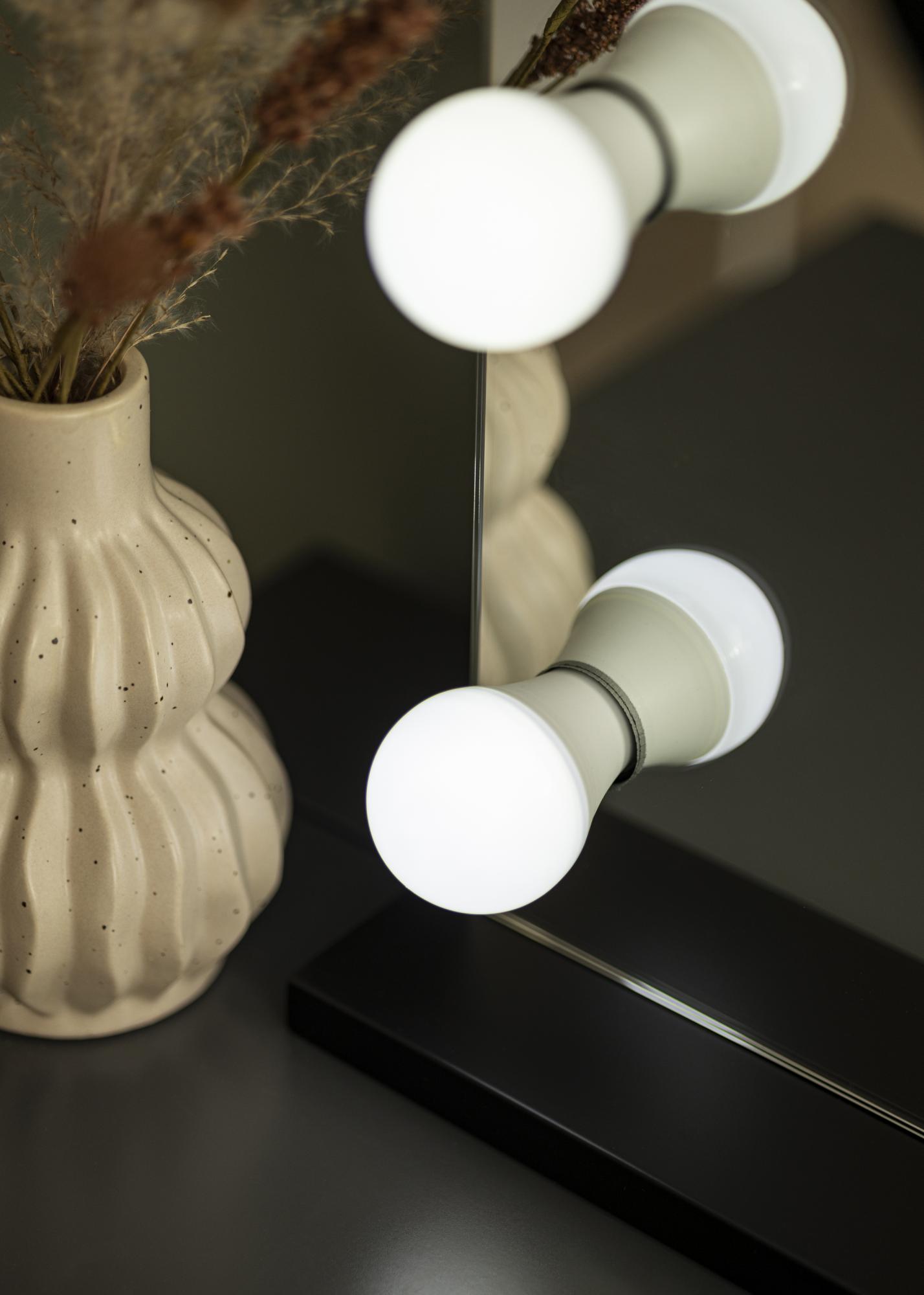 With a makeup mirror in a larger format, you can add style and function to the bedroom or living room. The surface of this mirror measures an impressive 100x80 cm which is beautifully framed by 15 light bulbs with E27 sockets. The clean design, classic rectangular shape and border of lights brings to mind the glamour of Hollywood. The bulbs emit a cool white light and can be adjusted to the desired brightness using the dimmer switch on the side of the mirror.