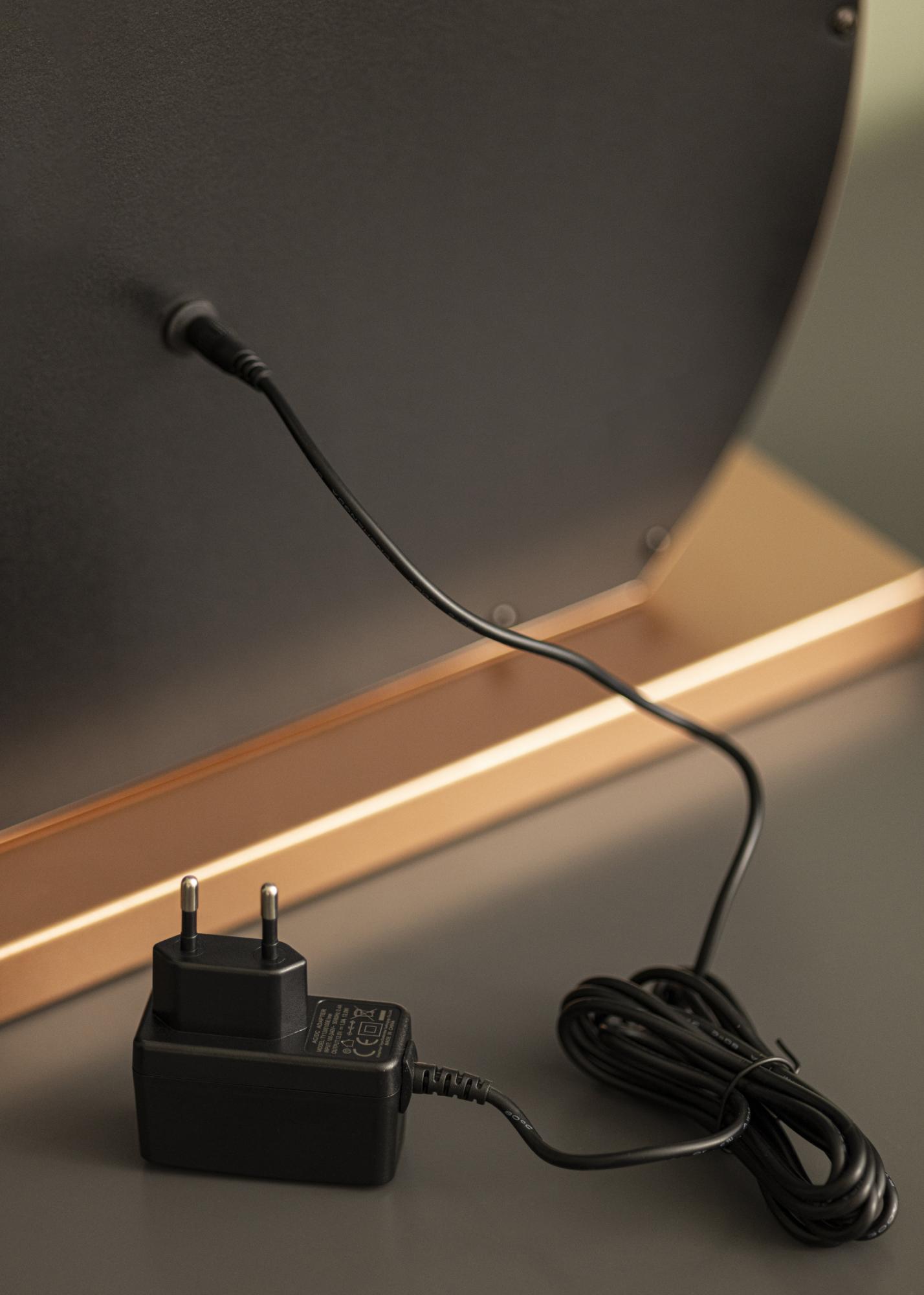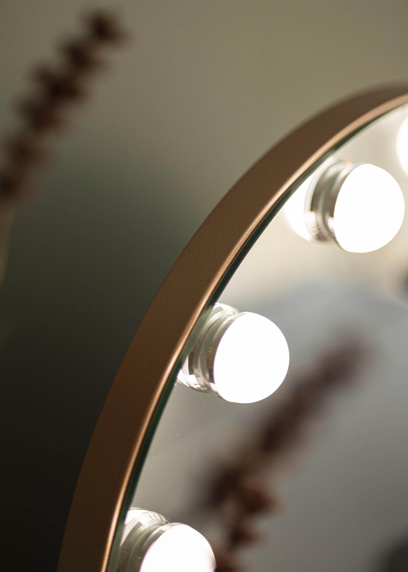 This 40x30 cm mirror has a classic round shape with 10 large LED lights around its outer edge. These lights give the mirror an exclusive look which is further enhanced by the beautiful rose gold colour of the stand. The lighting is activated by using the touch button on the front of the mirror. You can also set the colour temperature and brightness of the lights according to your personal preferences. These settings are accessed with the help of convenient touch buttons marked with "M" and “P” for adjusting colour temperature and brightness respectively. The three light temperatures you can choose from are warm, cool and natural light.