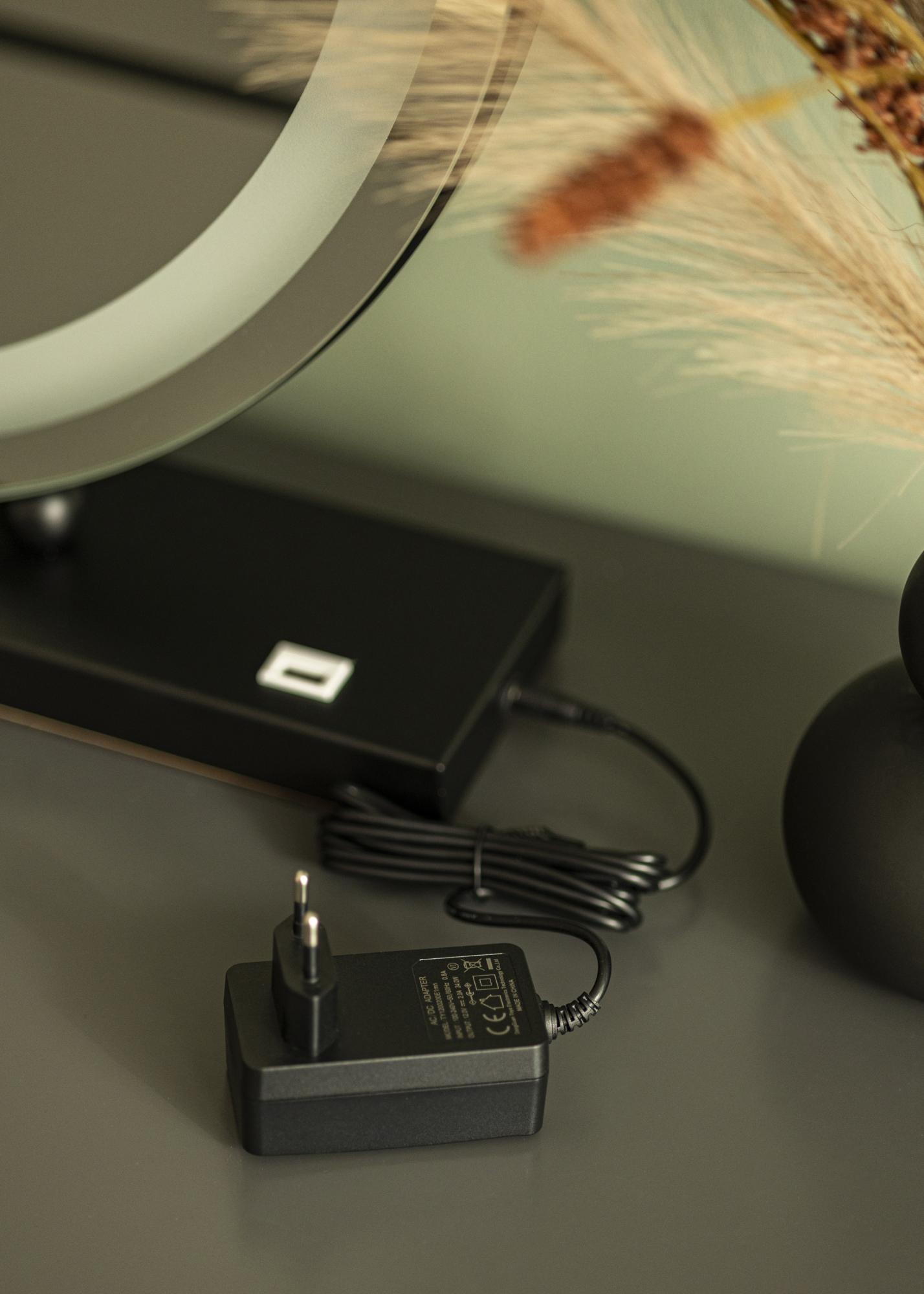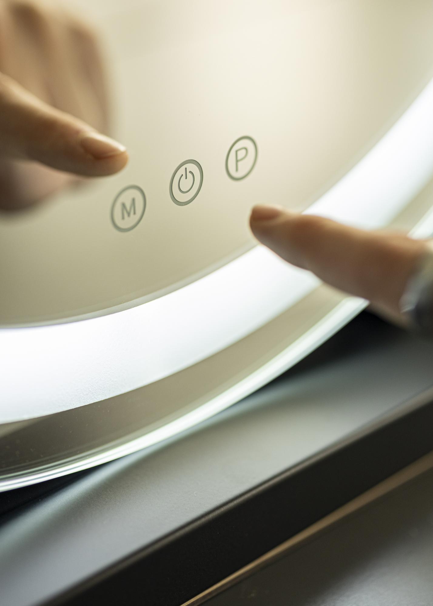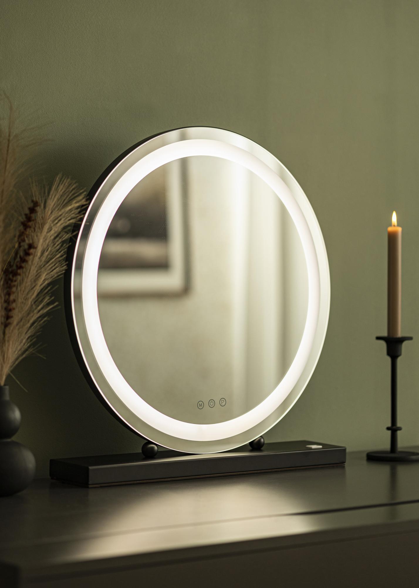 This is a standing model makeup mirror, with a base in a neutral black colour that can easily be matched with the rest of the decor. The mirror surface has a classic round shape with a diameter of 50 cm, beautifully framed by an integrated LED strip. There are three touch buttons at the lower edge of the mirror surface – an on/off button that turns the lighting on and off, an "M" button that adjusts the light's colour temperature, and a "P" button that allows you to dim the lighting's brightness as you wish. Electrical connection is made with a plug.