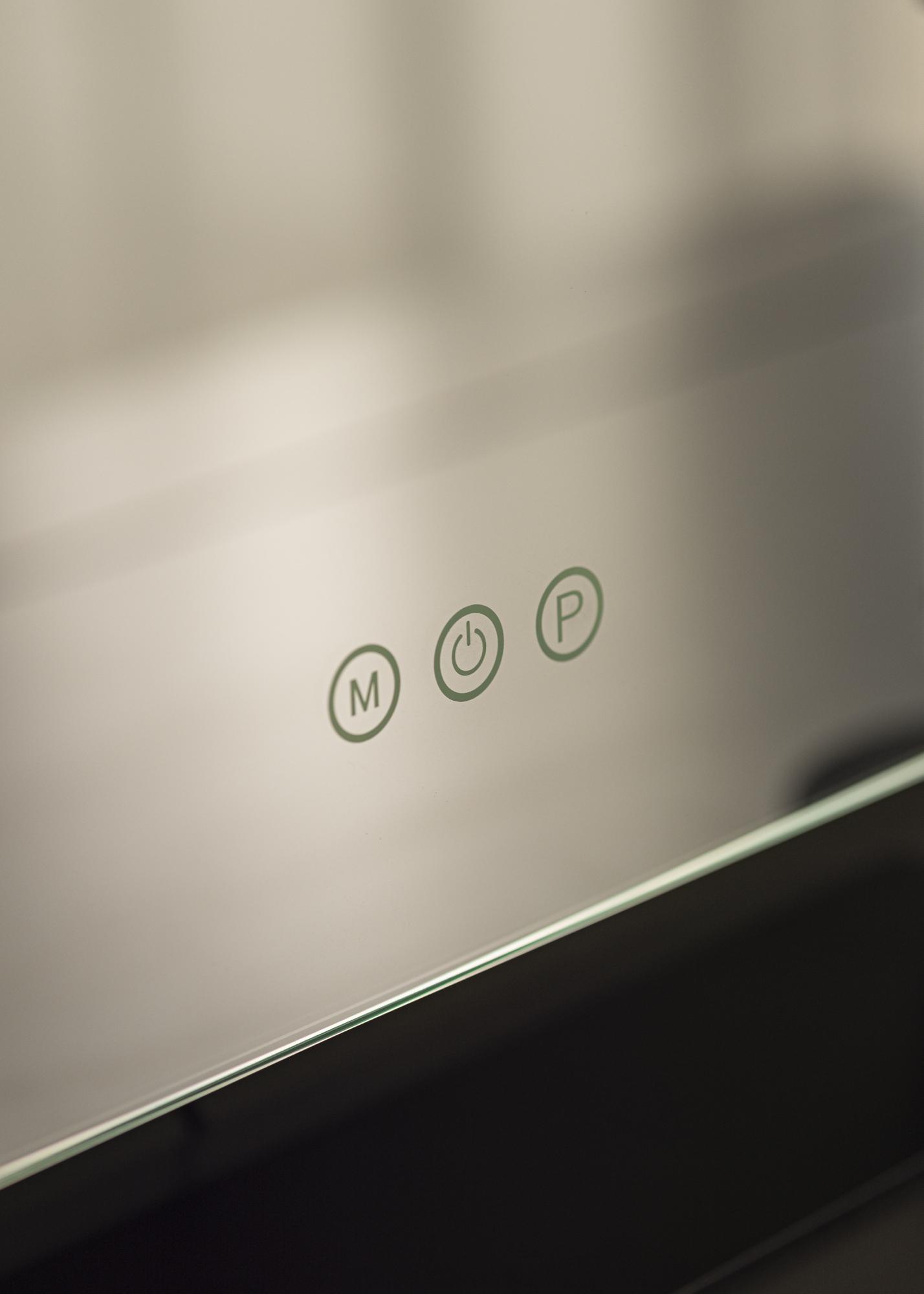 This mirror has an integrated LED strip that frames the mirror surface. You can dim the lighting using the touch button marked with "P" and adjust the light's colour temperature with the touch button marked with "M". In this way, you can change the mirror's light settings for every occasion, whether you want a soft background lighting or a sharper light that helps you focus on your reflection. There is also an on/off button that you can use to turn the mirror's lighting on and off. The electrical connection is made with a plug.