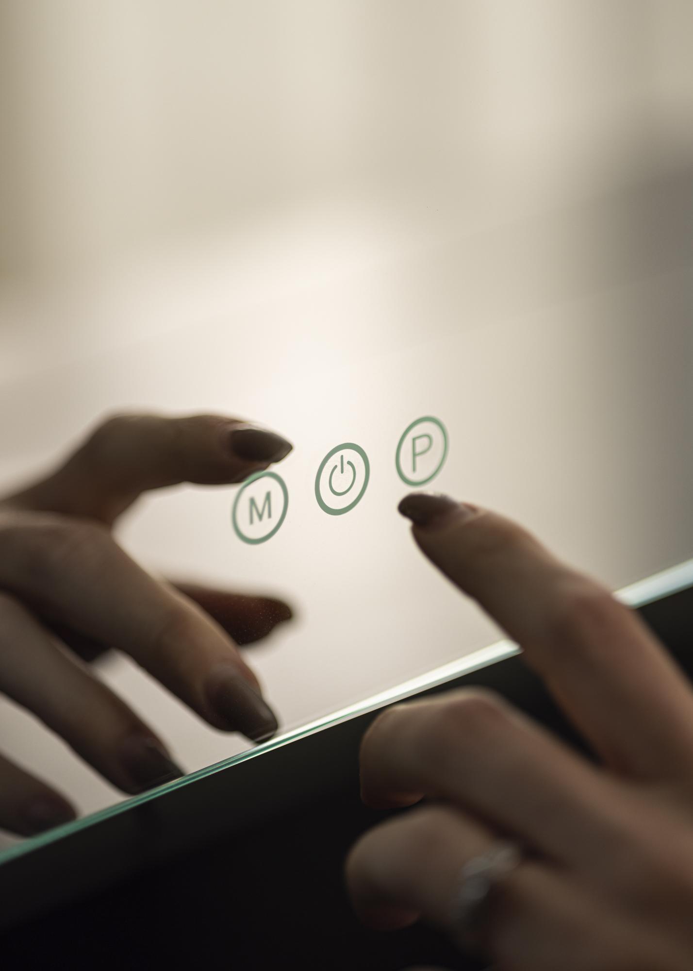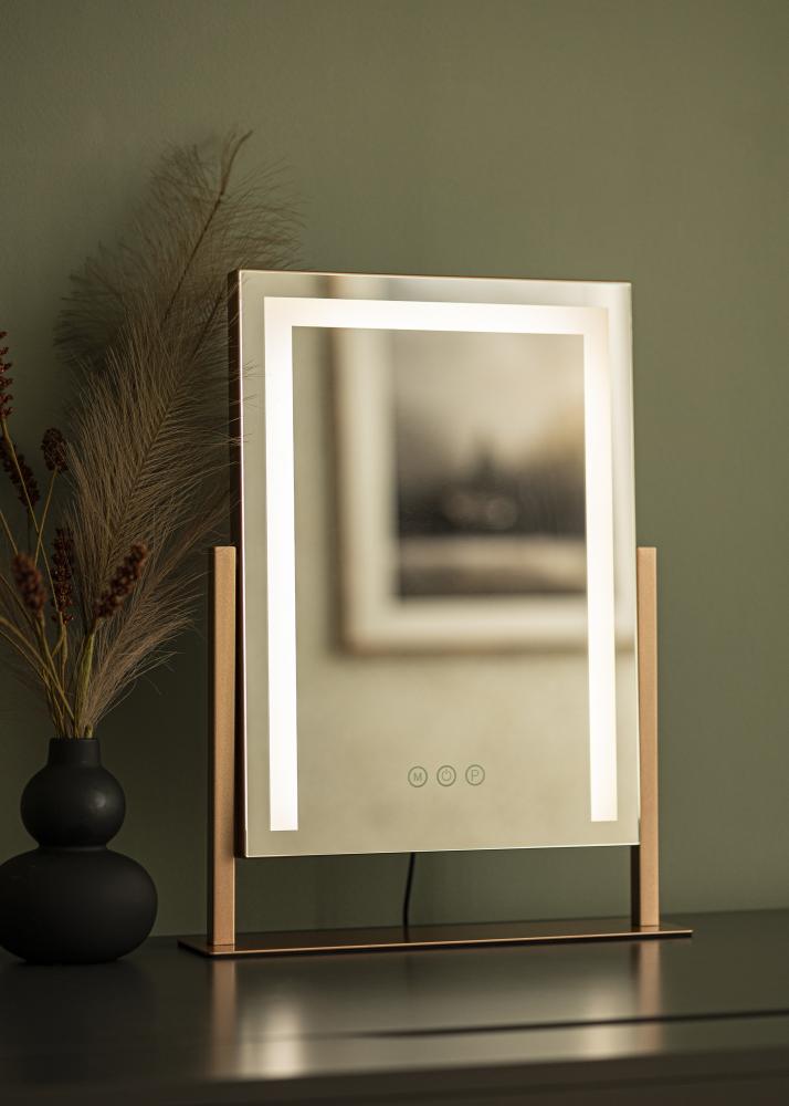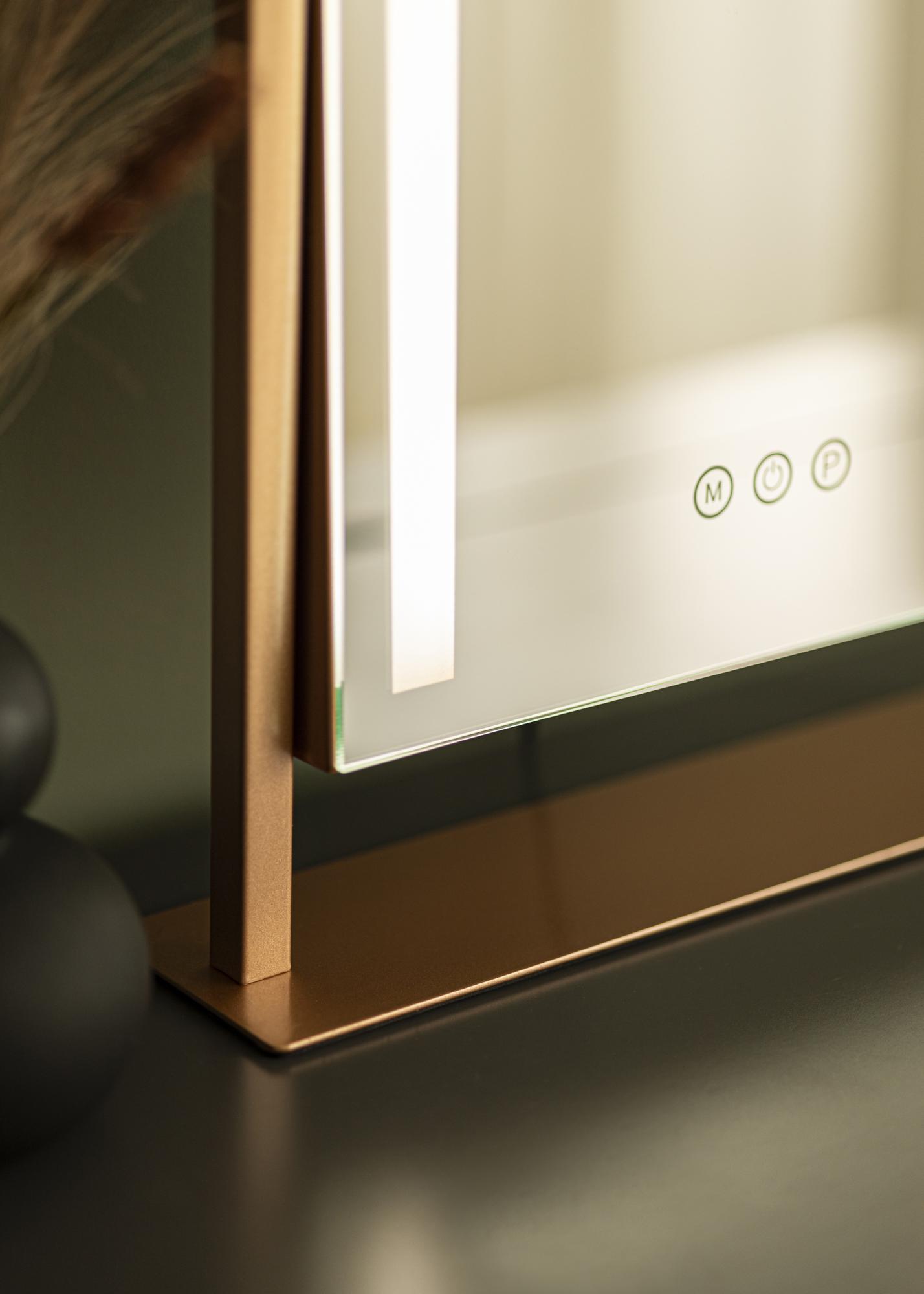 An elegant mirror with lighting becomes both a trendy interior detail and a perfect aid when you apply your makeup in the mornings. This is a model with a sophisticated metal construction in a shade of rose gold and an integrated LED strip that frames the mirror surface. You can turn the lighting on and off whenever you want and adjust the light to your liking – all with the help of touch buttons on the lower edge of the mirror. There is a classic on/off button as well as a button that adjusts the brightness (marked with "P") and a button that you use to set the light's colour temperature (marked with "M"). You can then choose between warm, cool, and natural light.