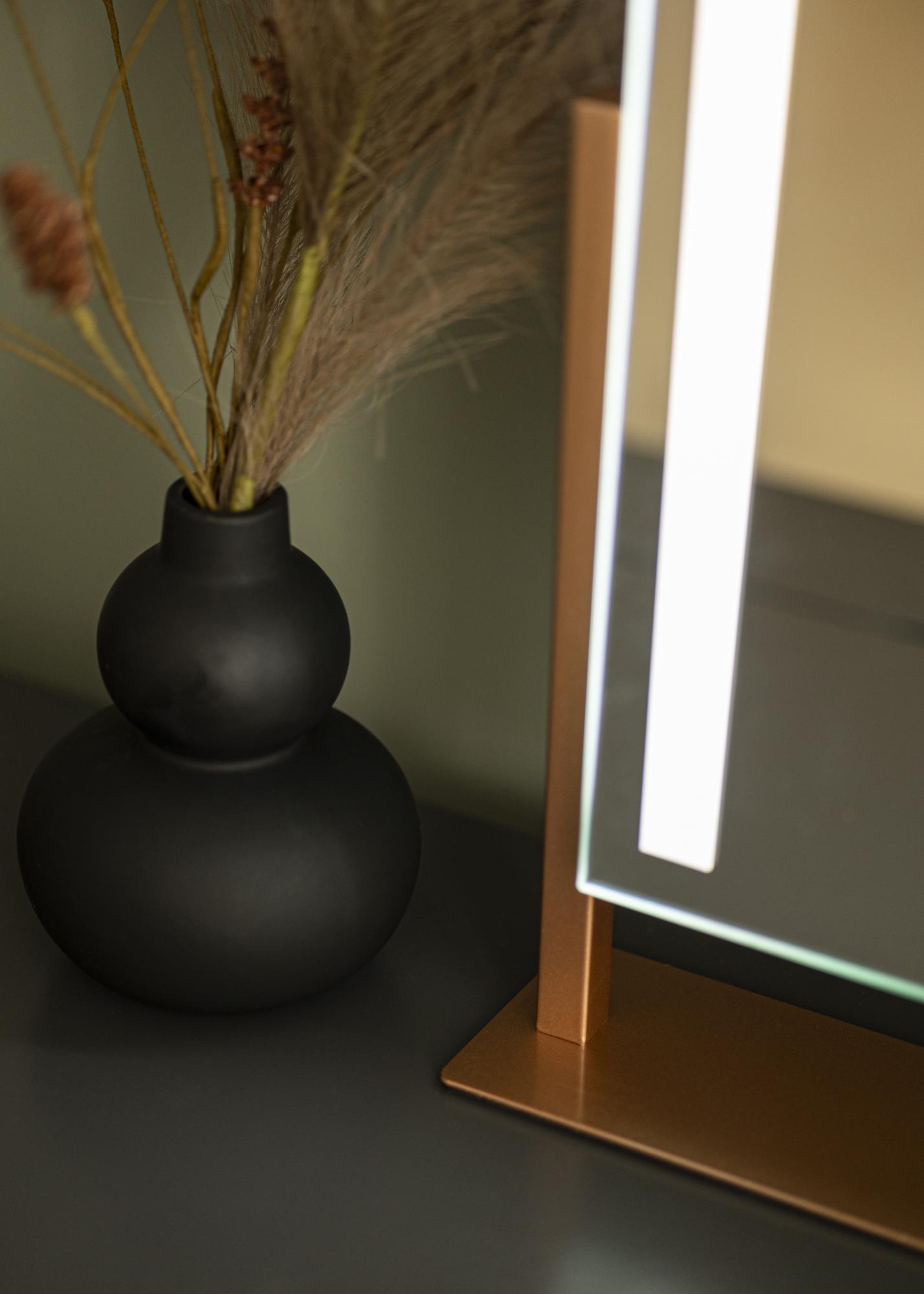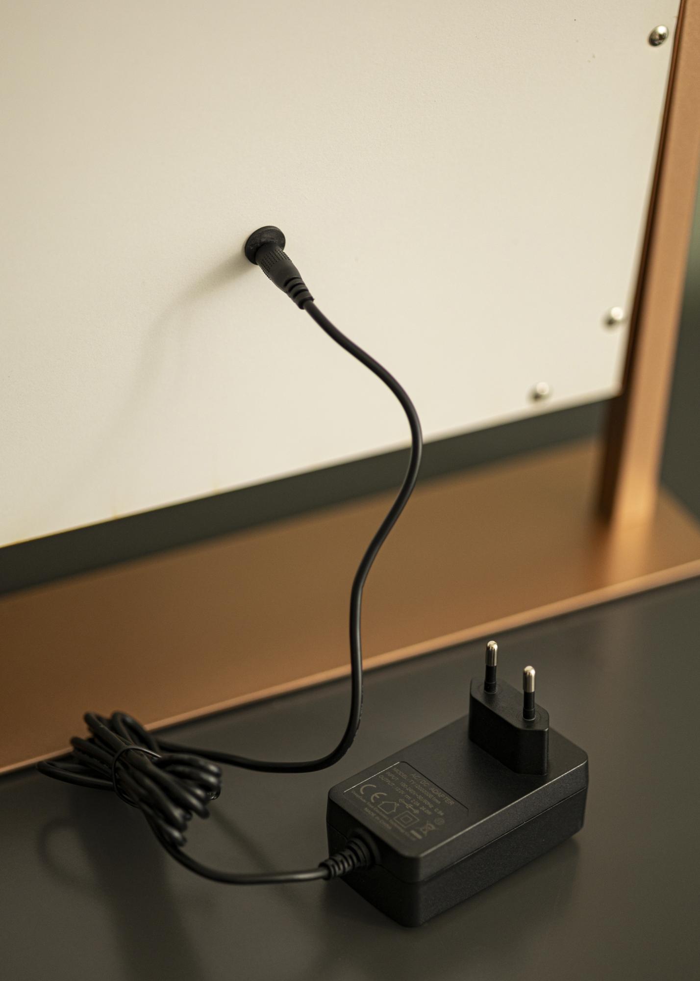 This makeup mirror is placed standing in your makeup corner, in the living room, or in any other room you wish for a stylish mirror. The standing design also allows you to angle the mirror surface. Electrical connection is made with a plug.