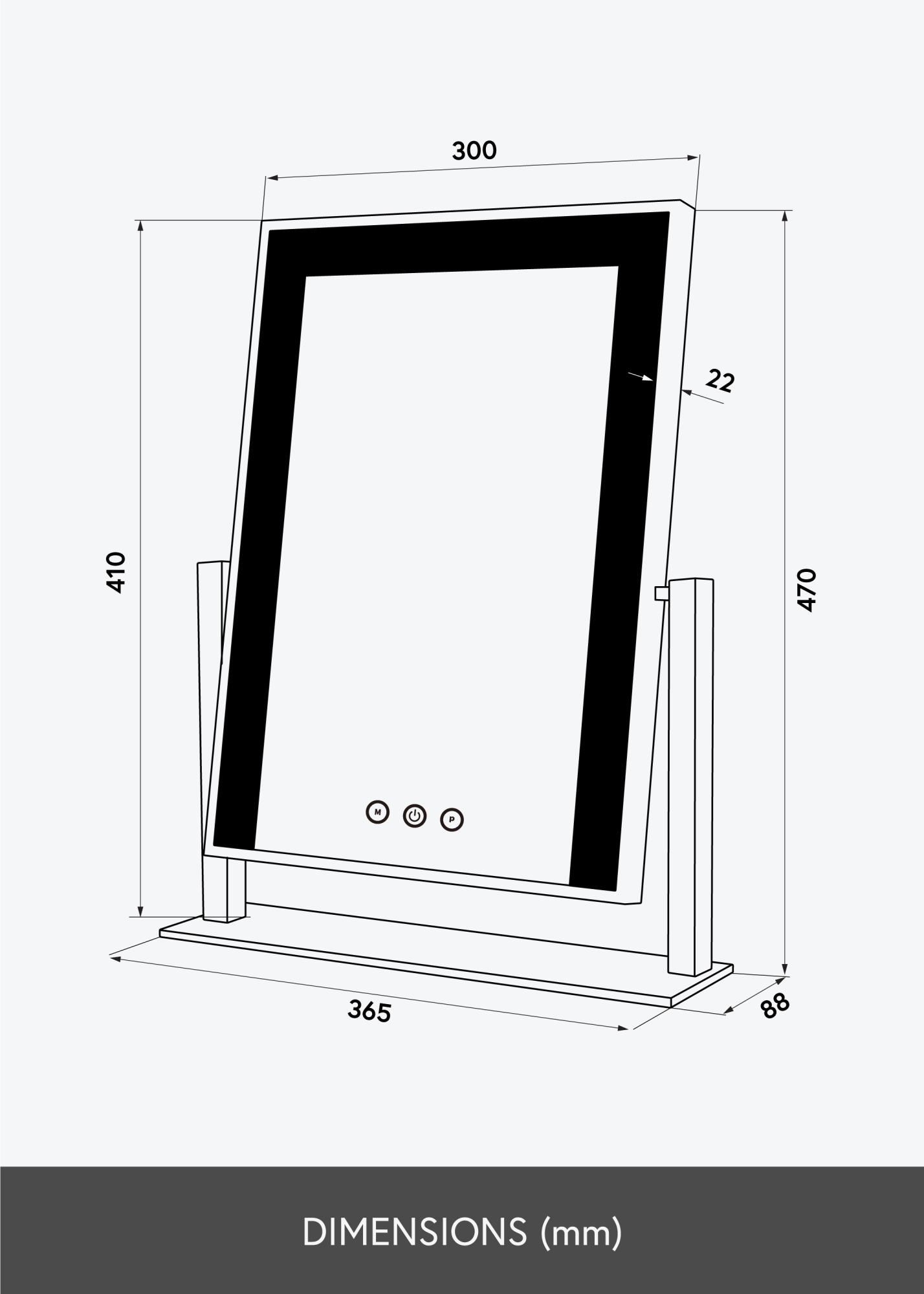 This mirror is a great choice if you’re looking for an elegant makeup mirror with inbuilt lighting. The lighting consists of a string of lights that run along the outer edge of the mirror which light your face with an even glow. On the front of the mirror there are three touch buttons with which you can turn the light on and off, select the colour temperature and adjust the brightness. You can choose between three different colour temperatures – warm, cool and natural light. This allows you to choose the right setting for the right occasion. You hold the "M" button to select the colour temperature and the "P" button to adjust the brightness.