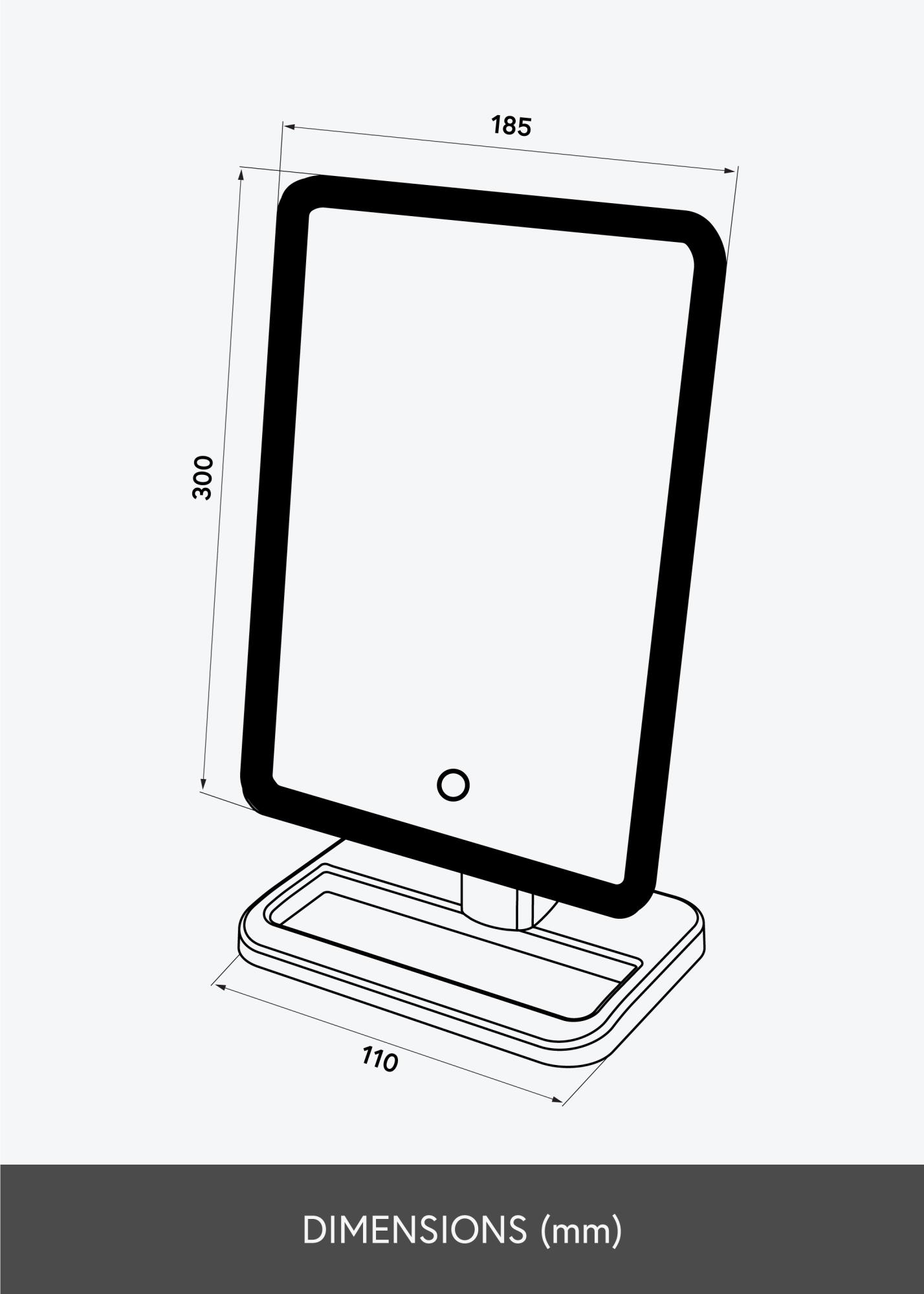 The mirror has a smart design with features that make it easier to get the result you want when applying makeup. The mirror is surrounded by LEDs to illuminate your face. Turn and tilt the mirror to achieve the position that works best for you. You can adjust the brightness by pressing the button on the mirror. It also comes with a smaller 10x zoom mirror which is great when you need to see close up details on your face. The mirror is powered by an inbuilt battery that is recharged using the USB cable provided.