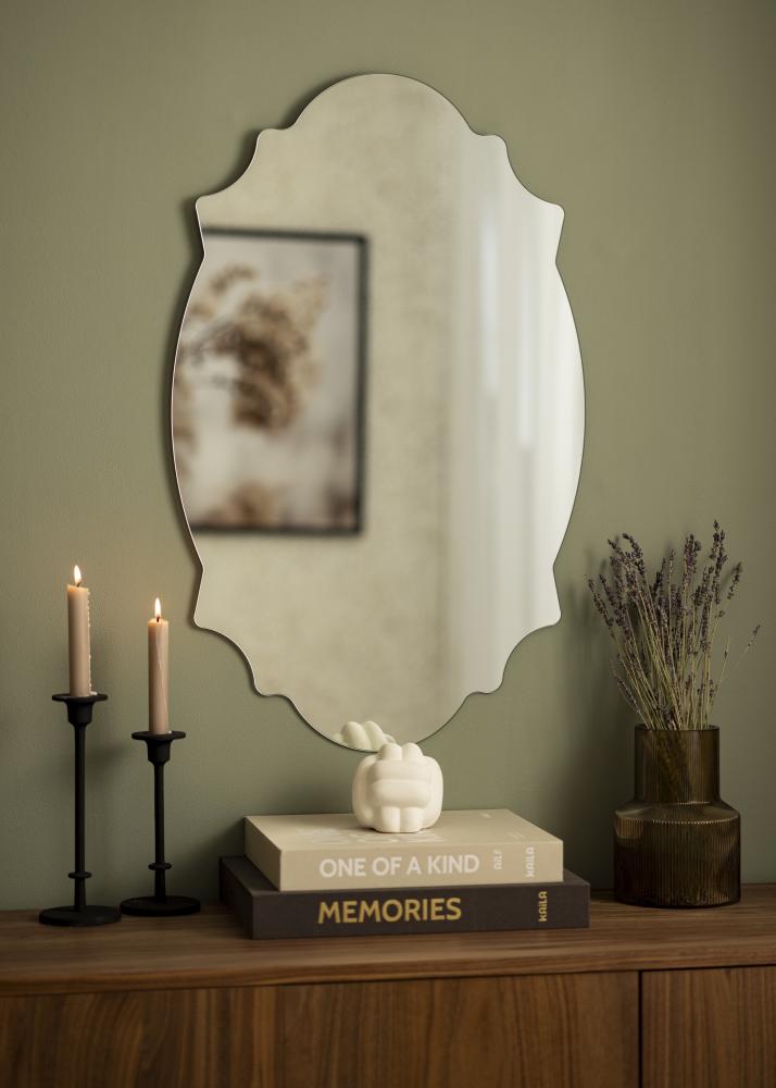 Stylish mirror from KAILA, with a beautiful wavy shape. The timeless design of the wall mirror is perfect for both the bedroom and living room. The mirror has a classic design with thin uncoloured mirror glass and a wall bracket for easy hanging. This mirror is sized 50x80 cm.